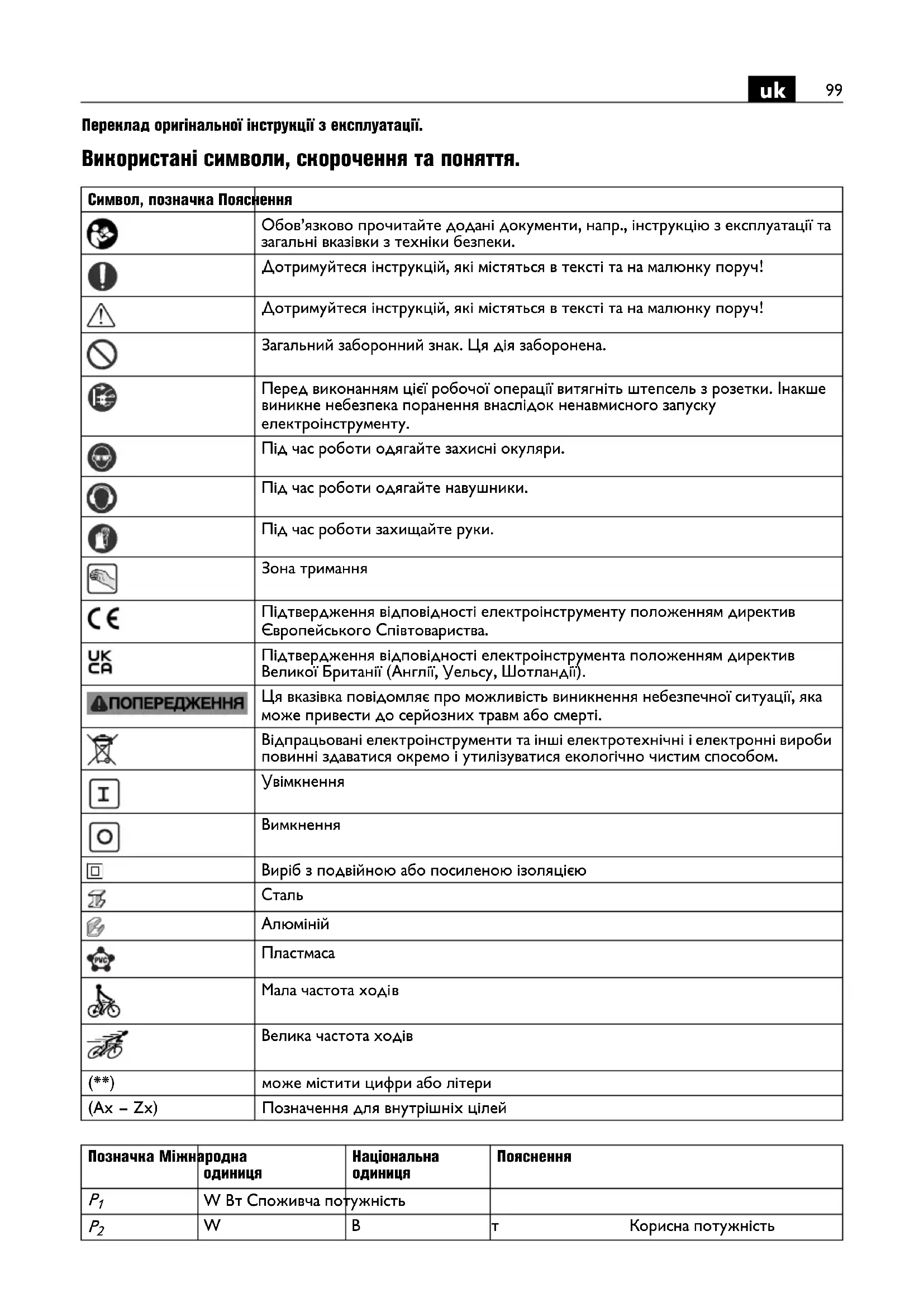 Переклад оригінальної інструкції з експлуатації. Використані символи, скорочення та поняття. Символ, позначка Пояснення Обов’язково прочитайте додані документи, напр., інструкцію з експлуатації та загальні вказівки з техніки безпеки. Дотримуйтеся інструкцій, які містяться в тексті та на малюнку поруч! Дотримуйтеся інструкцій, які містяться в тексті та на малюнку поруч! Загальний заборонний знак. Ця дія заборонена. Перед виконанням цієї робочої операції витягніть штепсель з розетки. Інакше виникне небезпека поранення внаслідок ненавмисного запуску електроінструменту. Під час роботи одягайте захисні окуляри. Під час роботи одягайте навушники. Під час роботи захищайте руки. Зона тримання Підтвердження відповідності електроінструменту положенням директив Європейського Співтовариства. Підтвердження в ідповідності електроінструмента положенням директив Великої Британії (Англії, Уельсу, Шотландії). Ця вказівка повідомляє про можливість виникнення небезпечної ситуації, яка може привести до серйозних травм або смерті. Відпрацьовані електроінструменти та інші електротехнічні і електронні вироби повинні здаватися окремо і утилізуватися екологічно чистим способом.