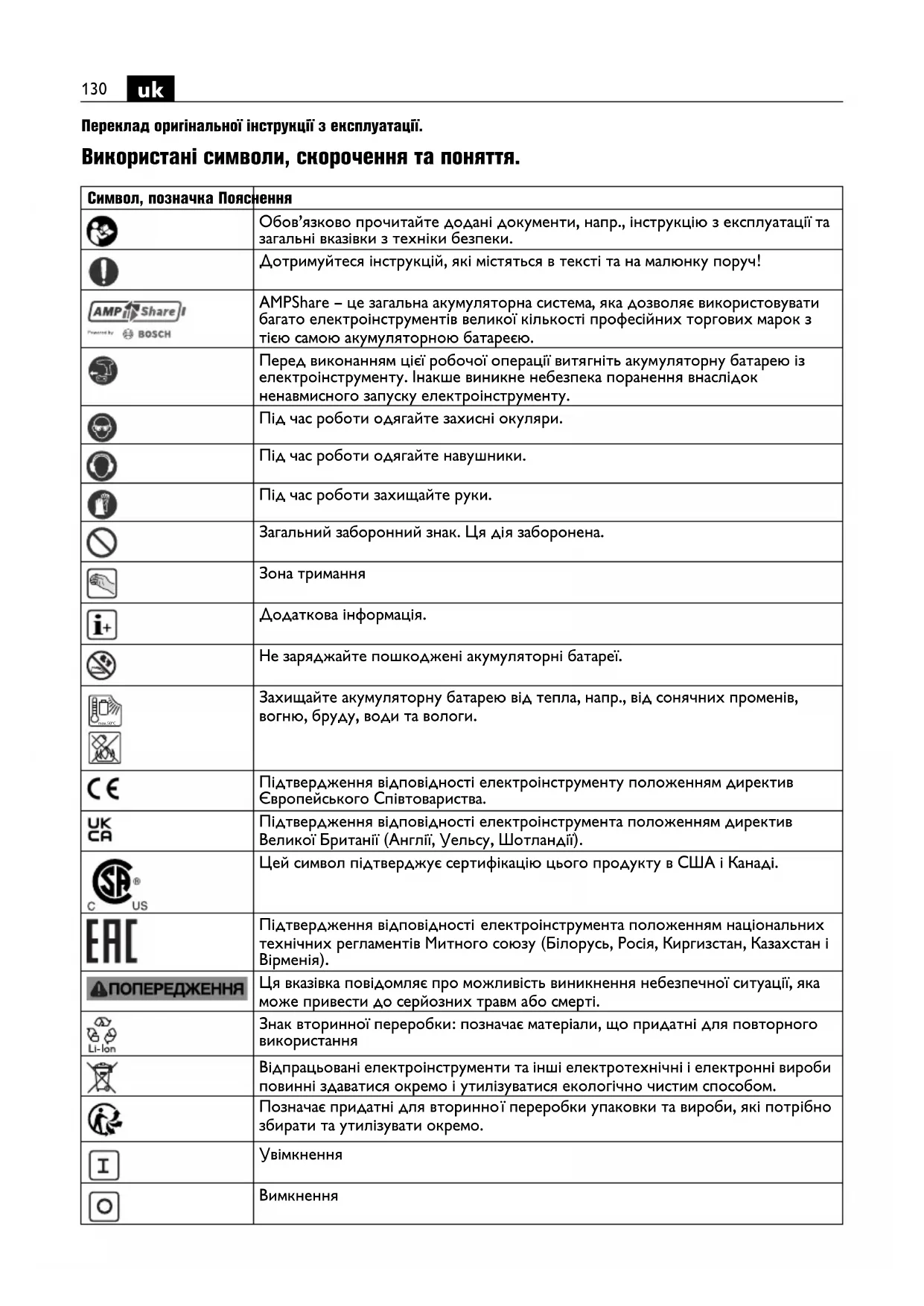 Переклад оригінальної інструкції з експлуатації. Використані символи, скорочення та поняття. Символ, позначка Пояснення Обов’язково прочитайте додані документи, напр., інструкцію з експлуатації та загальні вказівки з техніки безпеки. Дотримуйтеся інструкцій, які містяться в тексті та на малюнку поруч! AMPShare – це загальна акумуляторна система, яка дозволяє використовувати багато електроінструментів великої кількості професійних торгових марок з тією самою акумуляторною батареєю. Перед виконанням цієї робочої операції витягніть акумуляторну батарею із електроінструменту. Інакше виникне небезпека поранення внаслідок ненавмисного запуску електроінструменту. Під час роботи одягайте захисні окуляри. Під час роботи одягайте навушники. Під час роботи захищайте руки. Загальний заборонний знак. Ця ді я заборонена. Зона тримання Додаткова інформація. Не заряджайте пошкоджені акумуляторні батареї. Захищайте акумуляторну батарею від тепла, напр., від сонячних променів, вогню, бруду, води та вологи. Підтвердження відповідності електроінструменту положенням директив Європейського Співтовариства. Підтвердження відповідності електроінструмента положенням директив Великої Британії (Англії, Уельсу, Шотландії). Цей символ підтверджує сертифікацію цього продукту в США і Канаді. Підтвердження відповідності електроінструмента положенням національних технічних регламентів Митного союзу (Білорусь, Росія, Киргизстан, Казахстан і