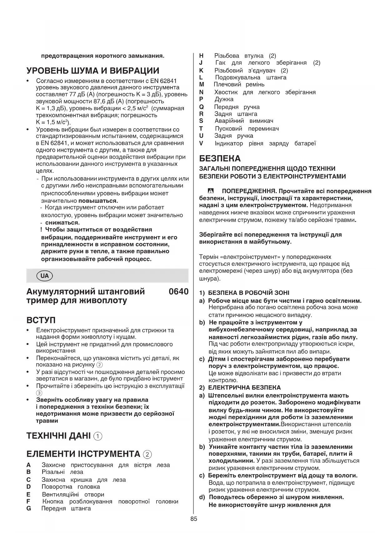 ТЕХНІЧНІ ДАНІ 1 ЕЛЕМЕНТИ ІНСТРУМЕНТА 2 A Захисне пристосування для вістря леза B Різальні леза C Захисна кришка для леза D Поворотна головка E Вентиляційні отвори F Кнопка розблокування поворотної головки G Передня штанга86 серйозну травму протягом долі секунди.