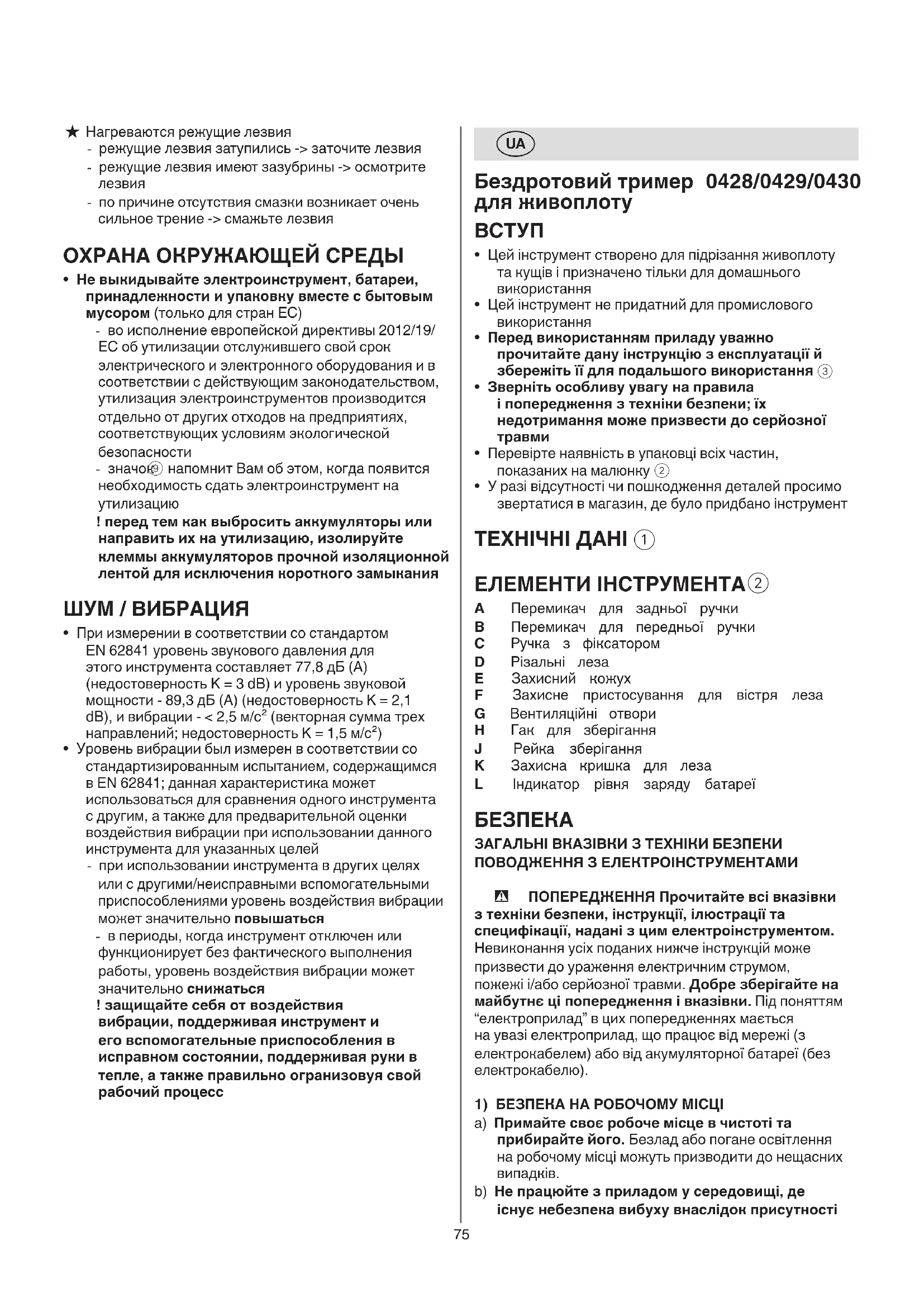 - Зміряний відповідно до EN 62841 рівень тиску звуку даного інструменту 77,8 дБ(А) (похибка K = 3 дБ) i потужність звуку 89,3 дБ(А) (похибка K = 2,1 дБ), i вібрація < 2,5 м/с² (векторна сума трьох напрямків; похибка K = 1,5 м/с²)