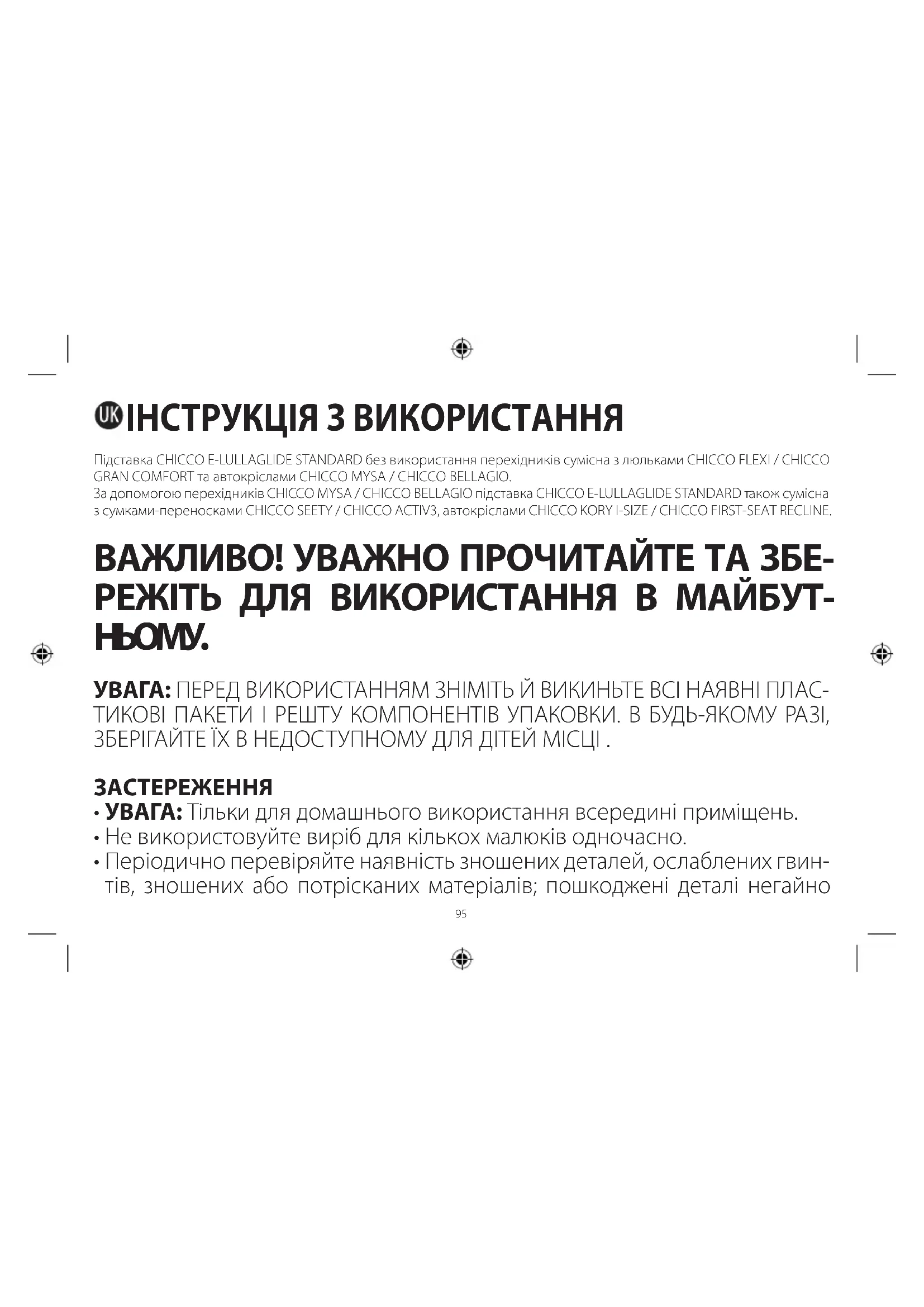 - УВАГА: Не дозволяйте іншим дітям гратися біля люльки-переноски без нагляду з боку дорослих та підставки. Використовуйте з сидінням коляски або автокріслом на підставці CHICCO E-LULLAGLIDE STANDARD: