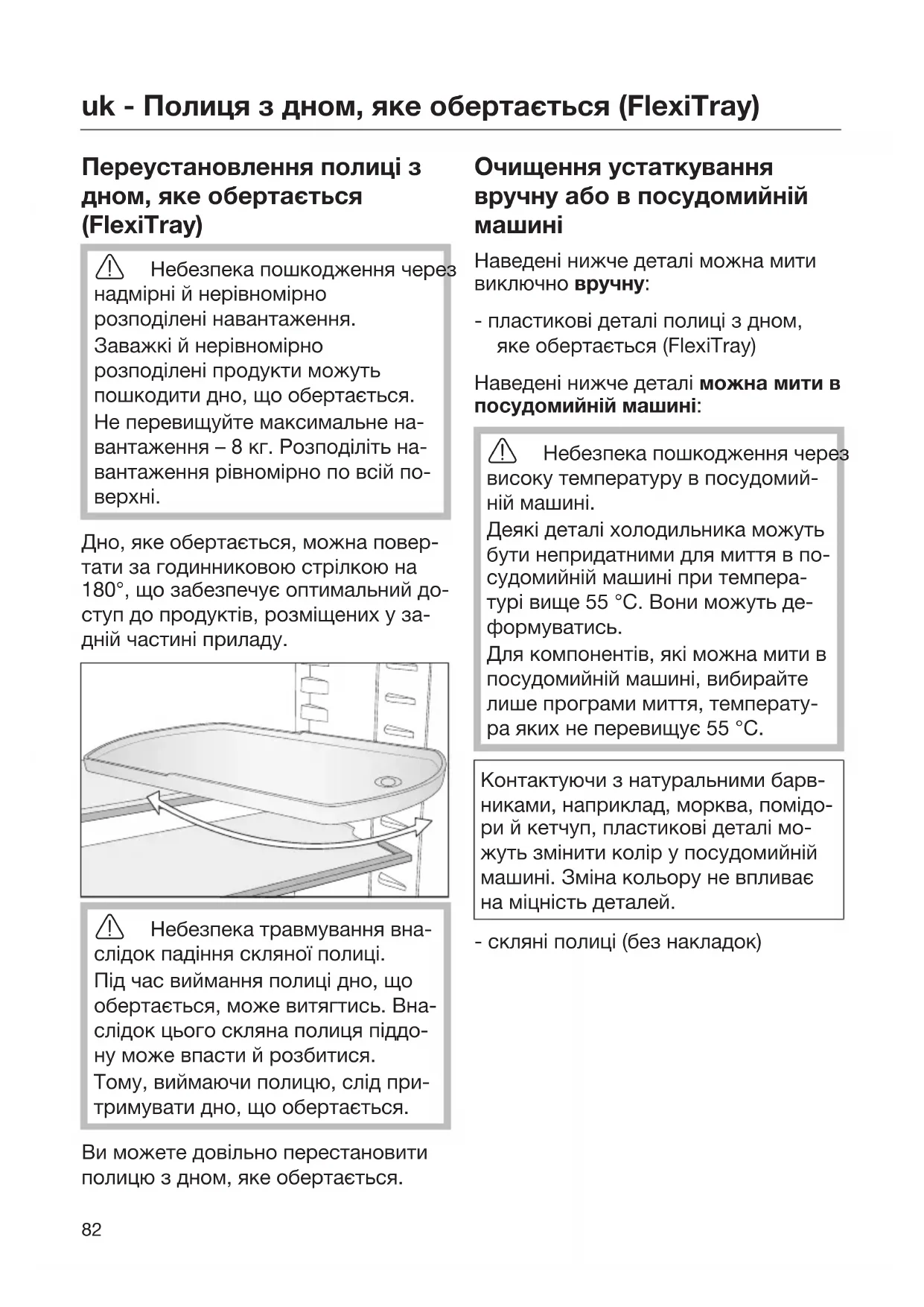 Дно, яке обертається, можна повер- тати за годинниковою стрілкою на 180°, що забезпечує оптимальний до- ступ до продуктів, розміщених у за- дній частині приладу. Небезпека травмування вна- слідок падіння скляної полиці. Під час виймання полиці дно, що обертається, може витягтись. Вна- слідок цього скляна полиця піддо- ну може впасти й розбитися. Тому, виймаючи полицю, слід при- тримувати дно, що обертається. Ви можете довільно перестановити полицю з дном, яке обертається. Очищення устаткування вручну або в посудомийній