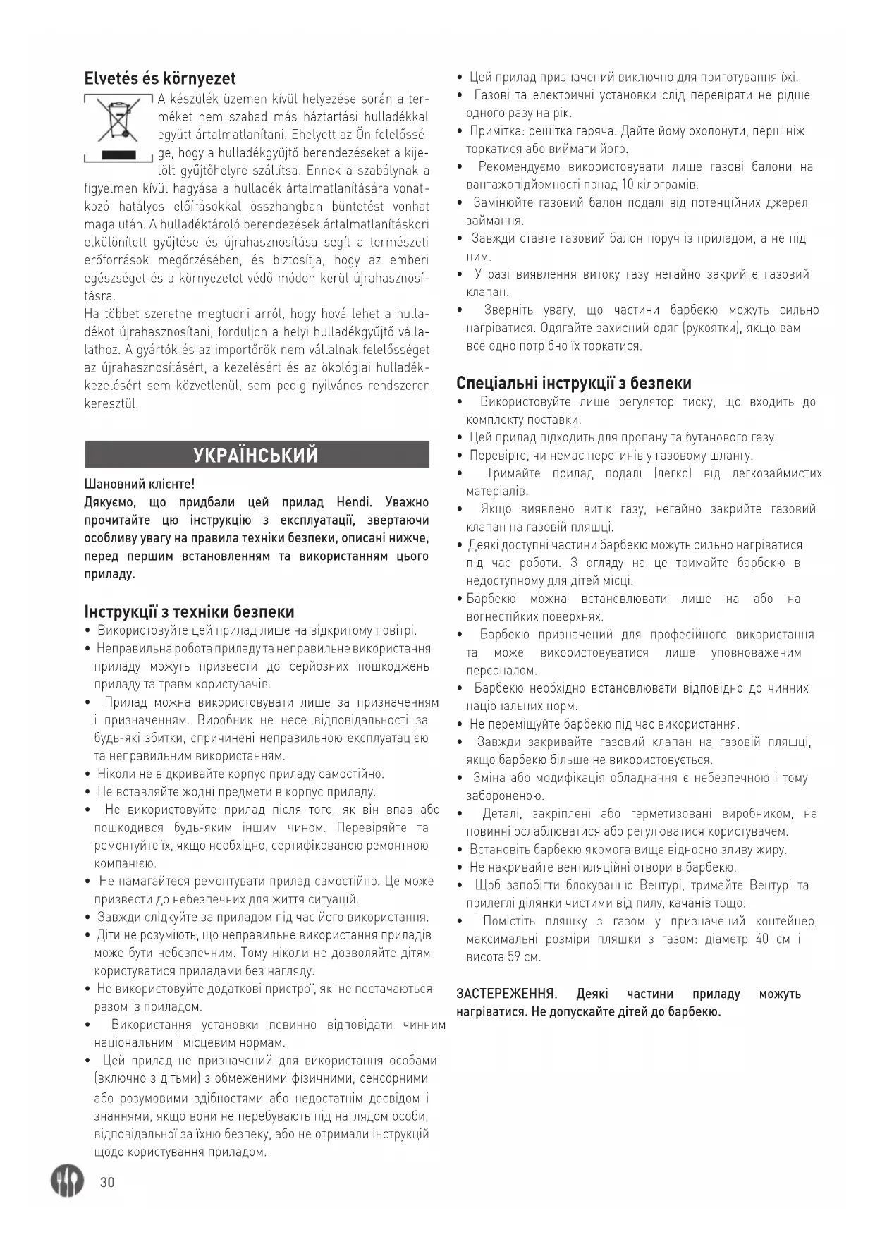 - Зверніть увагу, що частини барбекю можуть сильно нагріватися. Одягайте захисний одяг (рукоятки), якщо вам все одно потрібно їх торкатися. Спеціальні інструкції з безпеки