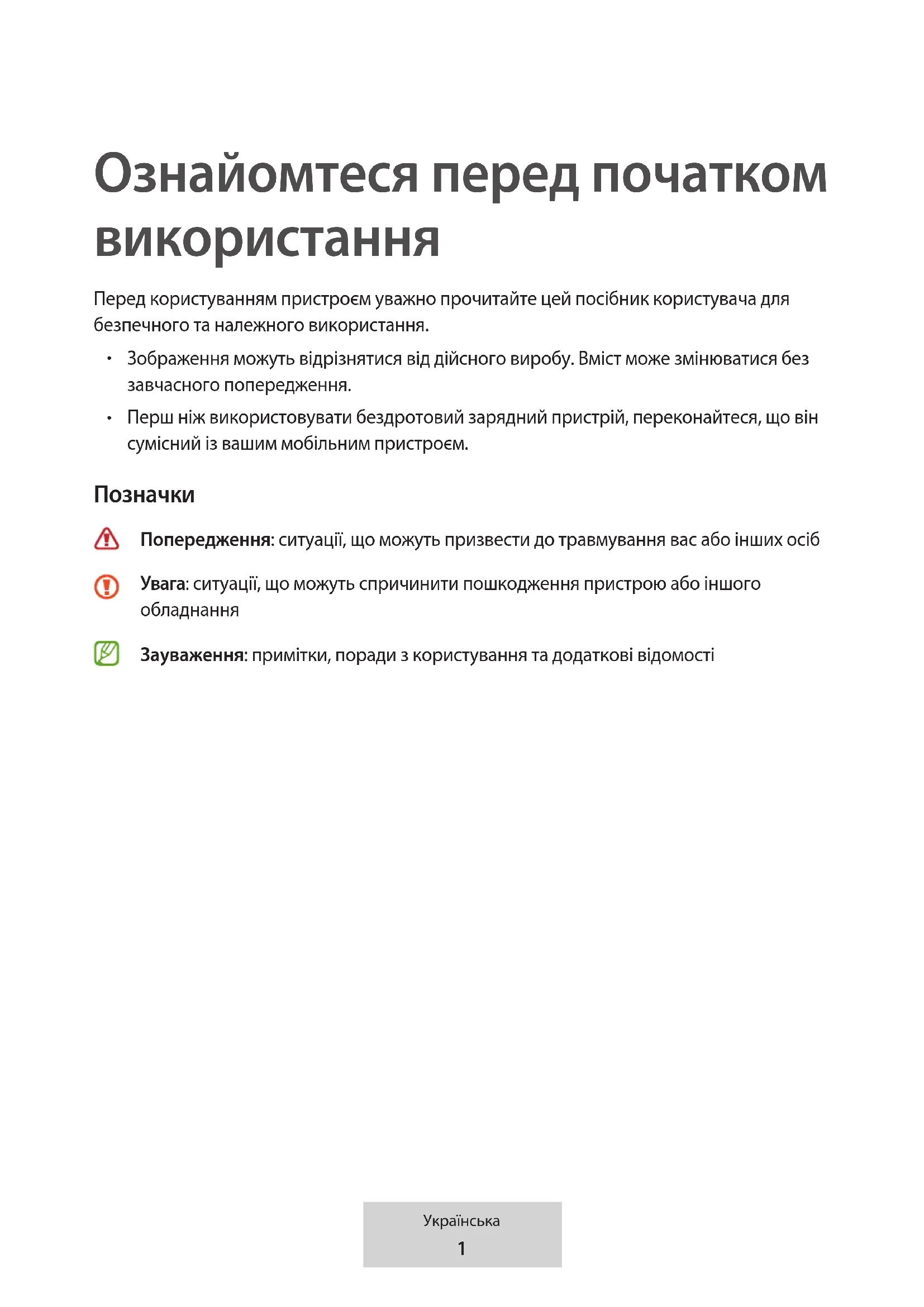 Попередження: ситуації, що можуть призвести до травмування вас або інших осіб Увага: ситуації, що можуть спричинити пошкодження пристрою або іншого