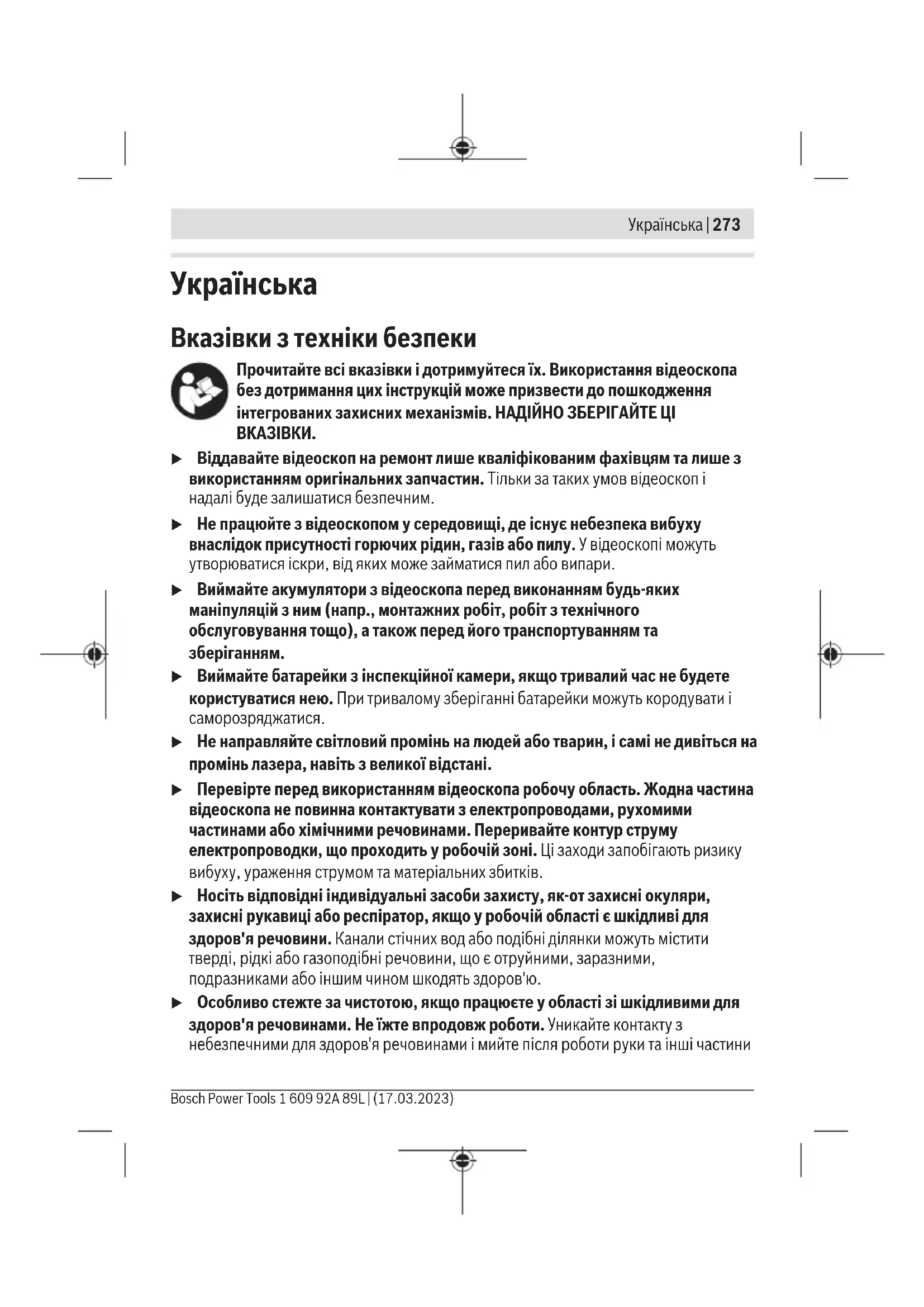 u Віддавайте відеоскоп на ремонт лише кваліфікованим фахівцям та лише з використанням оригінальних запчастин. Тільки за таких умов відеоскоп і надалі буде залишатися безпечним. u Не працюйте з відеоскопом у середовищі, де існує небезпека вибуху внаслідок присутності горючих рідин, газів або пилу. У відеоскопі можуть утворюватися іскри, від яких може займатися пил або випари. u Виймайте акумулятори з відеоскопа перед виконанням будь-яких маніпуляцій з ним (напр., монтажних робіт, робіт з технічного обслуговування тощо), а також перед його транспортуванням та зберіганням. u Виймайте батарейки з інспекційної камери, якщо тривалий час не будете користуватися нею. При тривалому зберіганні батарейки можуть кородувати і саморозряджатися. u Не направляйте світловий промінь на людей або тварин, і самі не дивіться на промінь лазера, навіть з великої відстані. u Перевірте перед використанням відеоскопа робочу область. Жодна частина відеоскопа не повинна контактувати з електропроводами, рухомими частинами або хімічними речовинами. Переривайте контур струму електропроводки, що проходить у робочій зоні. Ці заходи запобігають ризику вибуху, ураження струмом та матеріальних збитків. u Носіть відповідні індивідуальні засоби захисту, як-от захисні окуляри, захисні рукавиці або респіратор, якщо у робочій області є шкідливі для здоров'я речовини. Канали стічних вод або подібні ділянки можуть містити тверді, рідкі або газоподібні речовини, що є отруйними, заразними, подразниками або іншим чином шкодять здоров'ю. u Особливо стежте за чистотою, якщо працюєте у області зі шкідливими для здоров'я речовинами. Не їжте впродовж роботи. Уникайте контакту з небезпечними для здоров'я речовинами і мийте після роботи руки та інші частини Bosch Power Tools 1 609 92A 89L | (17.03.2023)274 | Українська тіла, що могли контактувати, гарячою водою з милом. Таким чином зменшується небезпека для здоров'я. u Не стійте у воді, коли використовуєте відеоскоп. Під час роботи у воді існує ризик ураження електрострумом. u Не відкривайте акумуляторну батарею. Існує небезпека короткого замикання. u При пошкодженні або неправильній експлуатації акумуляторної батареї може виходити пар. Акумуляторна батарея може займатись або вибухати. Впустіть свіже повітря і – у разі скарг – зверніться до лікаря. Пар може подразнювати дихальні шляхи. u При неправильному використанні з акумуляторної батареї може потекти рідина. Уникайте контакту з нею. При випадковому контакті промийте відповідне місце водою. Якщо рідина потрапила в очі, додатково зверніться до лікаря. Акумуляторна рідина може спричиняти подразнення шкіри або опіки. u Гострими предметами, напр., гвіздками або викрутками, або прикладанням зовнішньої сили можна пошкодити акумуляторну батарею. Можливе внутрішнє коротке замикання, загоряння, утворення диму, вибух або перегрів акумуляторної батареї. u Не зберігайте акумуляторну батарею, якою Ви саме не користуєтесь, поряд із канцелярськими скріпками, ключами, гвіздками, гвинтами та іншими невеликими металевими предметами, які можуть спричинити перемикання контактів. Коротке замикання між контактами акумуляторної батареї може спричиняти опіки або пожежу. u Використовуйте акумуляторну батарею лише у виробах виробника. Лише за таких умов акумулятор буде захищений від небезпечного переванта
