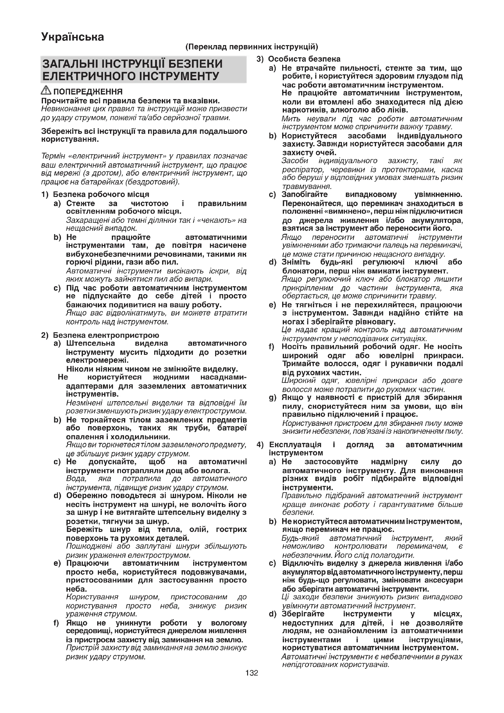 Відключіть виделку з джерела живлення і/або акумулятор від автоматичного інструменту, перш ніж будь-що регулювати, змінювати аксесуари або зберігати автоматичні інструменти. Ці заходи безпеки знижують ризик випадково увімкнути автоматичний інструмент. d) Зберігайте інструменти у місцях, недоступних для дітей, і не дозволяйте людям, не ознайомленим із автоматичними інструментами і цими інструкціями, користуватися автоматичним інструментом. Автоматичні інструменти є небезпечними в руках непідготованих користувачів. ЗАГАЛЬНІ ІНСТРУКЦІЇ БЕЗПЕКИ ЕЛЕКТРИЧНОГО ІНСТРУМЕНТУ ПОПЕРЕДЖЕННЯ Прочитайте всі правила безпеки та вказівки. Невиконання цих правил та інструкцій може призвести до удару струмом, пожежі та/або серйозної травми. Збережіть всі інструкції та правила для подальшого користування. Термін «електричний інструмент» у правилах позначає ваш електричний автоматичний інструмент, що працює від мережі (з дротом), або електричний інструмент, що