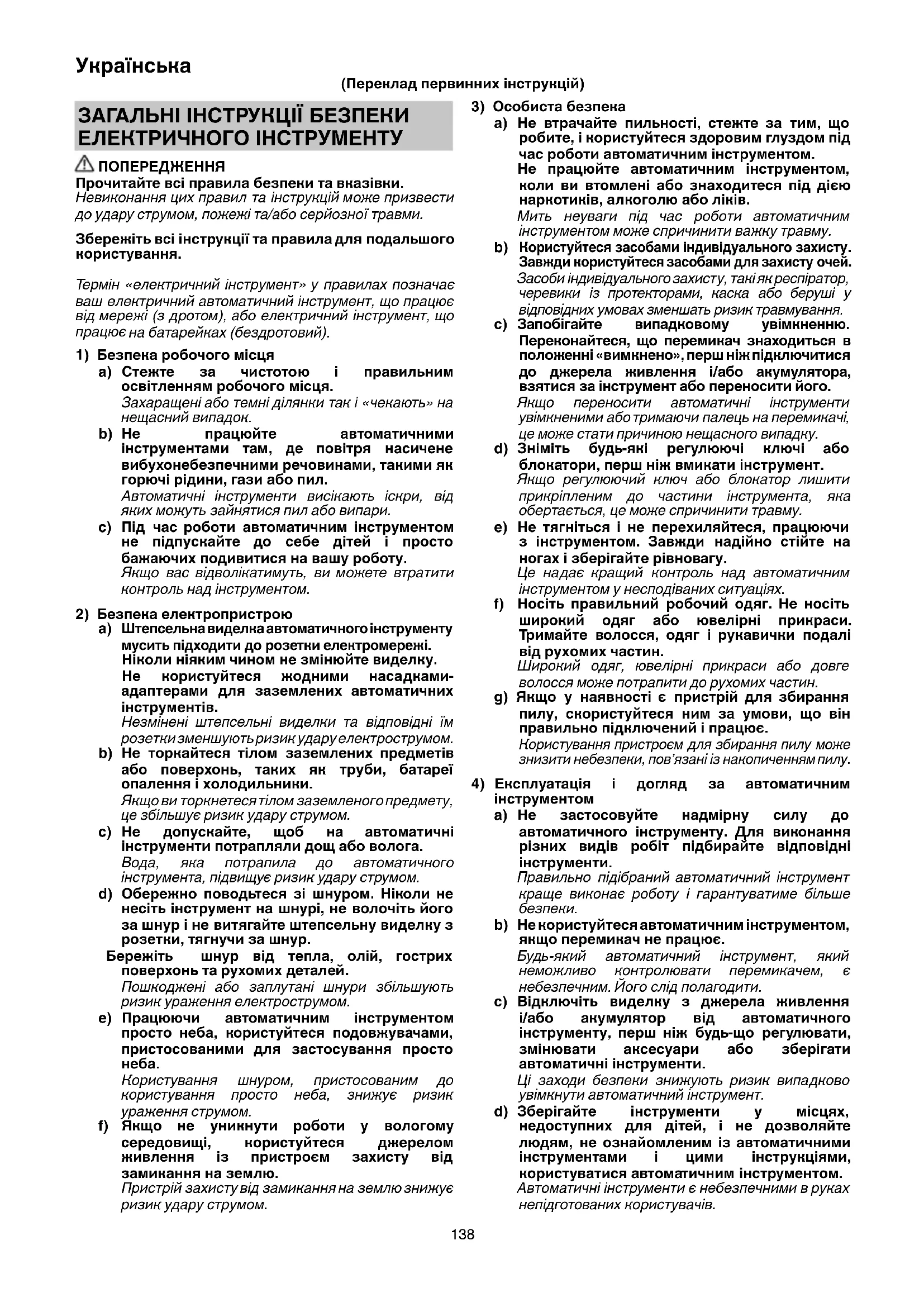 b) Не користуйтеся автоматичним інструментом, якщо перемикач не працює. Будь-який автоматичний інструмент, який неможливо контролювати перемикачем, є небезпечним. Його слід полагодити. c) Відключіть виделку з джерела живлення і/або акумулятор від автоматичного інструменту, перш ніж будь-що регулювати, змінювати аксесуари або зберігати автоматичні інструменти. Ці заходи безпеки знижують ризик випадково увімкнути автоматичний інструмент. d) Зберігайте інструменти у місцях, недоступних для дітей, і не дозволяйте людям, не ознайомленим із автоматичними інструментами і цими інструкціями, користуватися автоматичним інструментом. Автоматичні інструменти є небезпечними в руках непідготованих користувачів. ЗАГАЛЬНІ ІНСТРУКЦІЇ БЕЗПЕКИ ЕЛЕКТРИЧНОГО ІНСТРУМЕНТУ ПОПЕРЕДЖЕННЯ Прочитайте всі правила безпеки та вказівки. Невиконання цих правил та інструкцій може призвести до удару струмом, пожежі та/або серйозної травми. Збережіть всі інструкції та правила для подальшого користування. Термін «електричний інструмент» у правилах позначає ваш електричний автоматичний інструмент, що працює від мережі (з дротом), або електричний інструмент, що