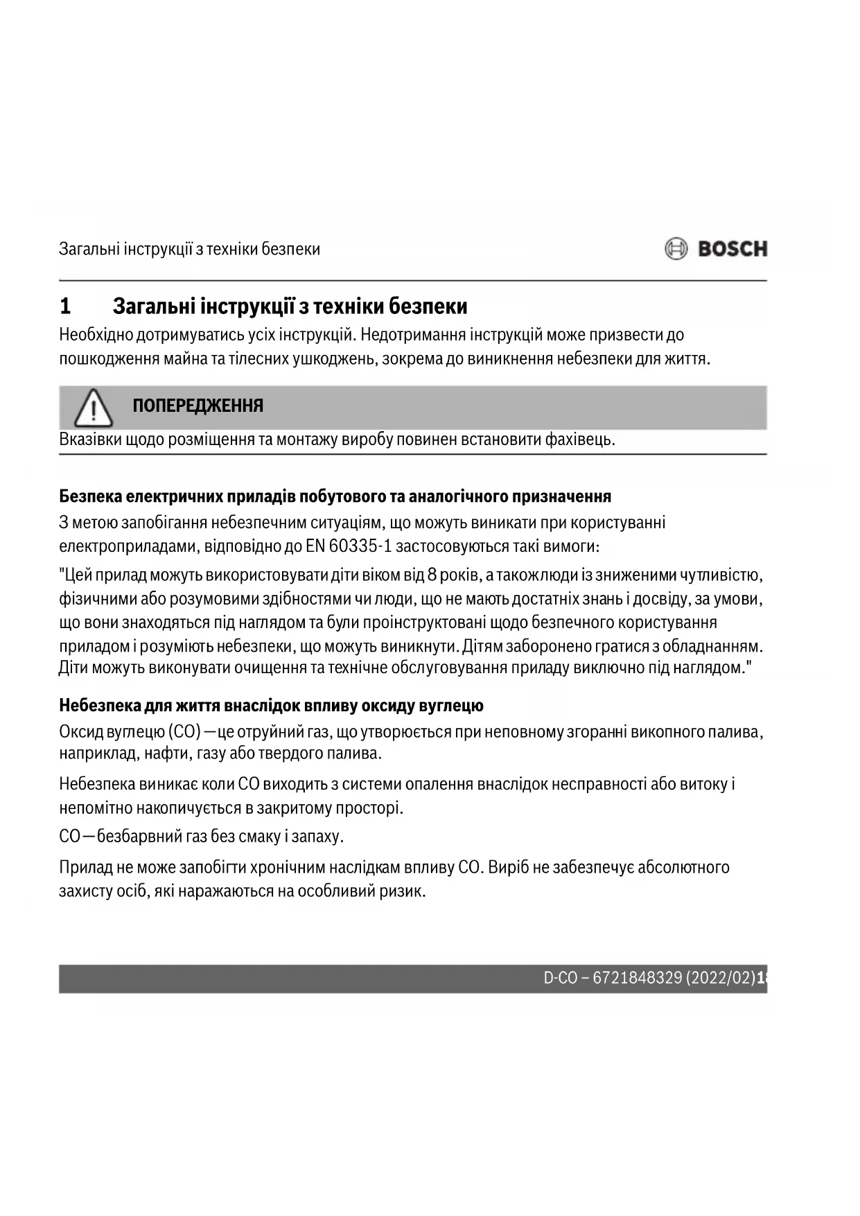 Telefonu:. . . . . . . . . . . . . . . . . . . . . . . . . . . . . . . . . . . . . . . . . . . Telefaksı:. . . . . . . . . . . . . . . . . . . . . . . . . . . . . . . . . . . . . . . . . . .Garanti Belgesi 185D-CO – 6721848329 (2022/02) Bosch Termoteknik Isıtma ve Klima Sanayi Ticaret Anonim Sirketi Merkez: Organize Sanayi Bölgesi - 45030 Manisa Irtibat Adresi: Aydınevler Mahallesi Inönü Caddesi No:20 Küçükyalı Ofıs Park A Blok 34854 Maltepe/Istanbul Tel: (0216) 432 0 800 Faks: (0216) 432 0 986 Isı Sistemleri Servis Destek Merkezi: 444 2 474 www.bosch-climate.com.tr www.boschtermoteknikservismerkezi.com Üretici Firma: Bosch Thermotechnik GmbH; D-73249 Wernau / Germany Çin’de üretilmistir. Kullanım Ömrü 10 Yıldır. Sikayet ve itirazlarınız konusundaki basvurularınızı tüketici mahkemelerine ve tüketici hakem heyetlerine yapabilirsiniz. Malın ayıplı olması durumunda; a) Satılanı geri vermeye hazır oldugunu bildirerek sözlesmeden dönme, b) Satılanı alıkoyup ayıp oranında satıs bedelinden indirim isteme, c) Asırı bir masraf gerektirmedigi takdirde, bütün masrafları satıcıya ait olmak üzere satılanın ücretsiz onarılmasını isteme, ç) Imkân varsa, satılanın ay ıpsız bir misli ile degistirilmesini isteme, haklarından birisi kullanılabilir.Загальні інструкції з техніки безпеки D-CO – 6721848329 (2022/02)186 1 Загальні інструкції з техніки безпеки Необхідно дотримуватись усіх інструкцій. Недотримання інструкцій може призвести до пошкодження майна та тілесних ушкоджень, зокрема до виникнення небезпеки для життя. ПОПEPEДЖEHHЯ Вказівки щодо розміщення та монтажу виробу повинен встановити фахівець. Безпека електричних приладів побутового та аналогічного призначення З метою запобігання небезпечним ситуаціям, що можуть виникати при користуванні електроприладами, відповідно до EN 60335-1 застосовуються такі вимоги: "Цей прилад можуть використовувати діти віком від 8 років, а також люди із зниженими чутливістю, фізичними або розумовими здібностями чи люди, що не мають достатніх знань і досвіду, за умови, що вони знаходяться під наглядом та були проінструктовані щодо безпечного користування приладом і розуміють небезпеки, що можуть виникнути. Дітям заборонено гратися з обладнанням. Діти можуть виконувати очищення та технічне обслуговування приладу виключно під наглядом." Небезпека для життя внаслідок впливу оксиду вуглецю Оксид вуглецю (CO) — це отруйний газ, що утворюється при неповному згоранні викопного палива, наприклад, нафти, газу або твердого палива. Небезпека виникає коли CO виходить з системи опалення внаслідок несправності або витоку і непомітно накопичується в закритому просторі. CO — безбарвний газ без смаку і запаху. Прилад не може запобігти хронічним наслідкам впливу CO. Виріб не забезпечує абсолютного захисту осіб, які наражаються на особливий ризик.Загальні інструкції з техніки безпеки 187D-CO – 6721848329 (2022/02) Перевірку та обслуговування системи опалення повинні виконувати фахівці авторизованої спеціалізованої компанії на регулярній основі. ПОПEPEДЖEHHЯ Установка сигналізації не повинна використовуватися як заміна належного монтажу, використання та обслуговування приладів, що спалюють паливо, включно з відповідними вентиляційними та витяжними системами. Дії у разі спрацьовування сигналу тривоги про наявність оксиду вуглецю ▶ Зберігайте спокій, відкрийте всі двері та вікна, щоб прискорити вентиляцію. ▶Припиніть використовувати всі прилади для спалювання палива і переконайтеся, за можливості, що вони вимкнені. Наприклад, у випадку газових приладів закрийте аварійний регулювальний клапан. ▶ Якщо сигнал тривоги продовжує лунати, вийдіть з приміщення. Входити у приміщення можна лише після припинення сигналу тривоги. У багатоповерхових і багатоквартирних помешканнях попередьте всіх мешканців про небезпеку ▶Зверніться за медичною допомогою для тих, у ко