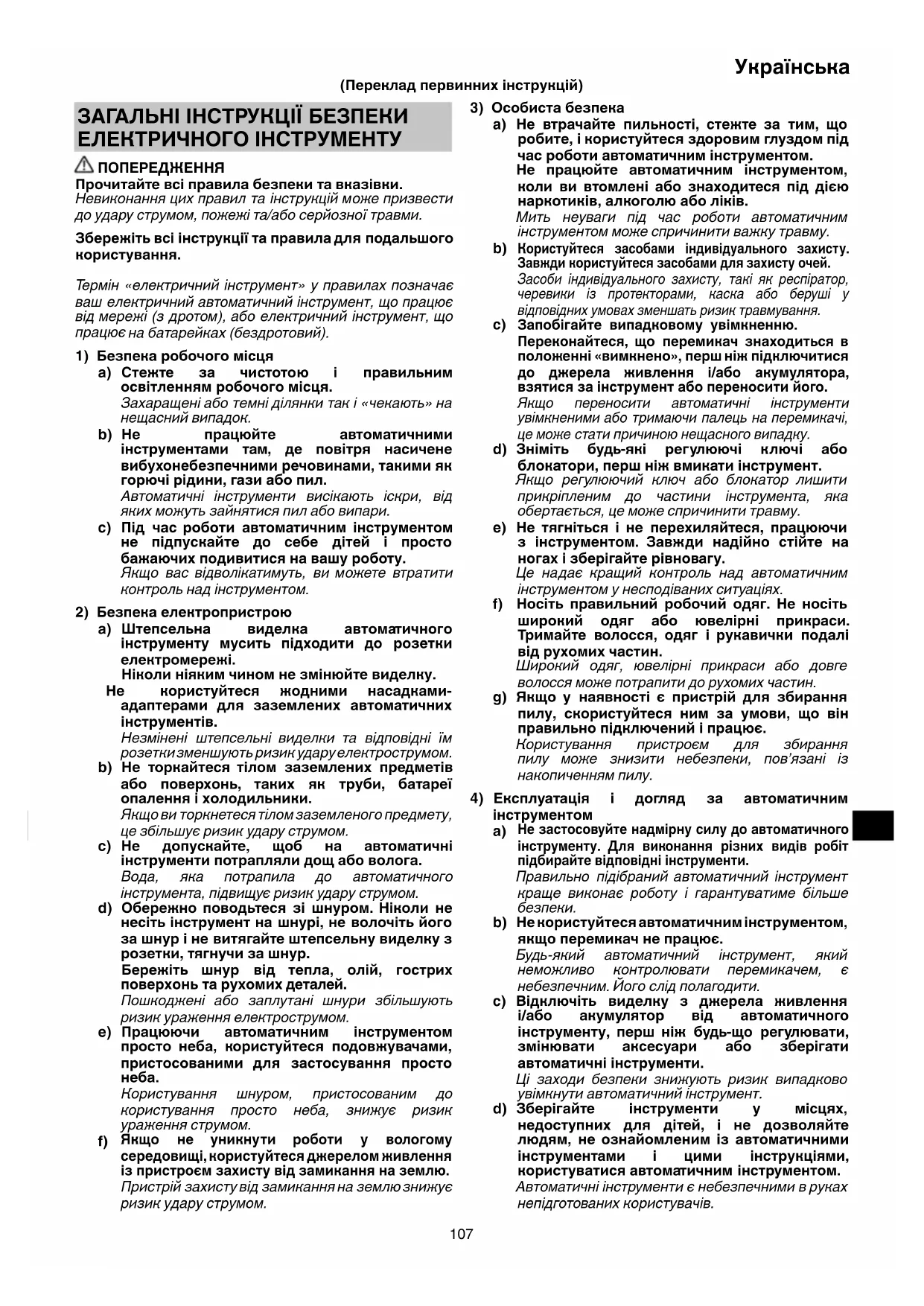 аксесуари або зберігати автоматичні інструменти. Ці заходи безпеки знижують ризик випадково увімкнути автоматичний інструмент. d) Зберігайте інструменти у місцях, недоступних для дітей, і не дозволяйте людям, не ознайомленим із автоматичними інструментами і цими інструкціями, користуватися автоматичним інструментом. Автоматичні інструменти є небезпечними в руках непідготованих користувачів. ЗАГАЛЬНІ ІНСТРУКЦІЇ БЕЗПЕКИ ЕЛЕКТРИЧНОГО ІНСТРУМЕНТУ ПОПЕРЕДЖЕННЯ Прочитайте всі правила безпеки та вказівки. Невиконання цих правил та інструкцій може призвести до удару струмом, пожежі та/або серйозної травми. Збережіть всі інструкції та правила для подальшого користування. Термін «електричний інструмент» у правилах позначає ваш електричний автоматичний інструмент, що працює від мережі (з дротом), або електричний інструмент, що