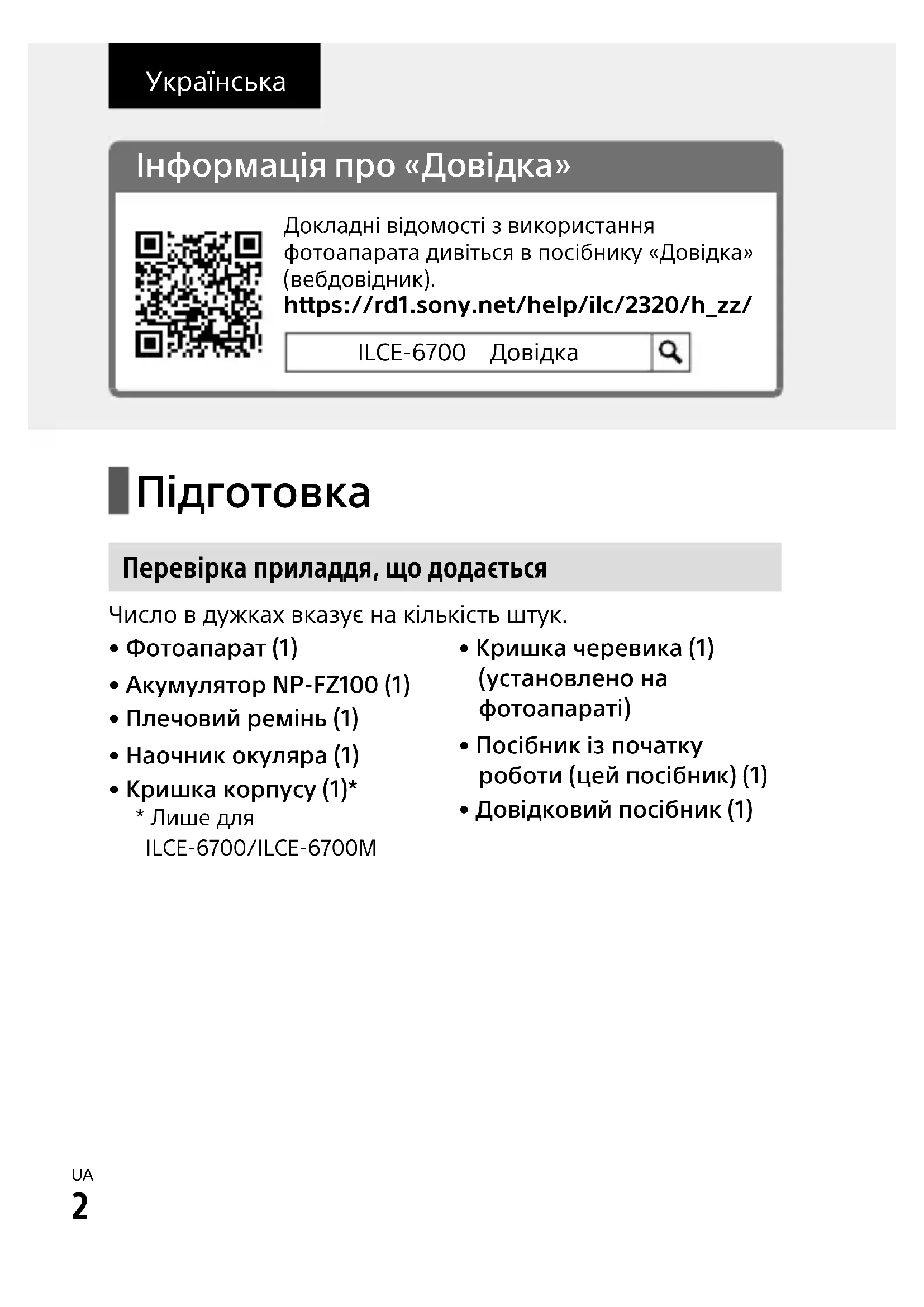 Перевірка приладдя, що додається Число в дужках вказує на кількість штук.• Фотоапарат (1)• Акумулятор NP-FZ100 (1)• Плечовий ремінь (1)• Наочник окуляра (1)• Кришка корпусу (1)** Лише для ILCE-6700/ILCE-6700M• Кришка черевика (1) (установлено на фотоапараті)• Посібник із початку роботи (цей посібник) (1)• Довідковий посібник (1)UA