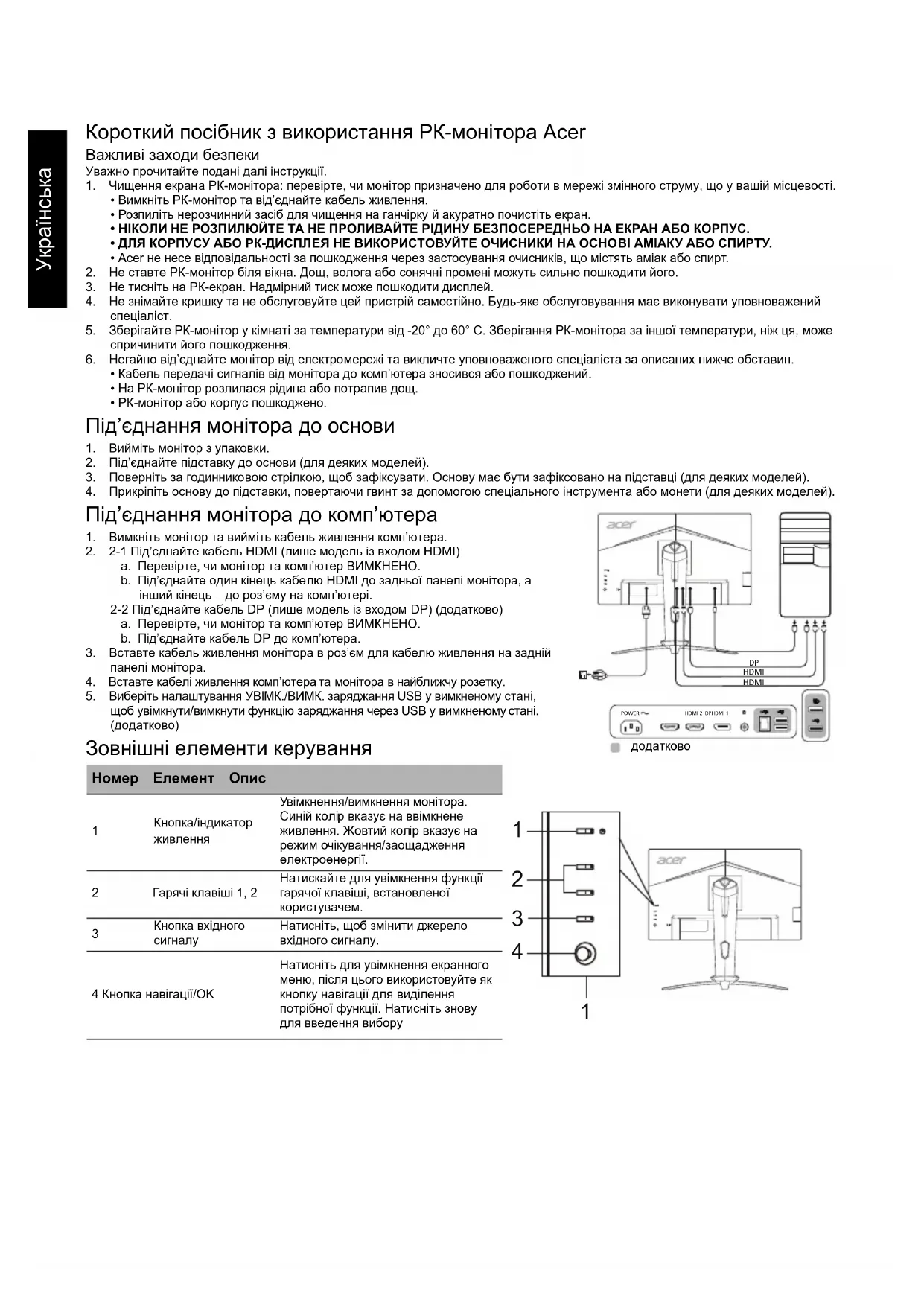 Кнопка/індикатор живлення Увімкнення/вимкнення монітора. Синій колір вказує на ввімкнене живлення. Жовтий колір вказує на режим очікування/заощадження електроенергії. 2 Гарячі клавіші 1, 2 Натискайте для увімкнення функції гарячої клавіші, встановленої користувачем. Кнопка вхідного сигналу Натисніть, щоб змінити джерело вхідного сигналу. 4 Кнопка навігації/OK Натисніть для увімкнення екранного меню, після цього використовуйте як кнопку навігації для виділення потрібної функції. Натисніть знову для введення вибору
