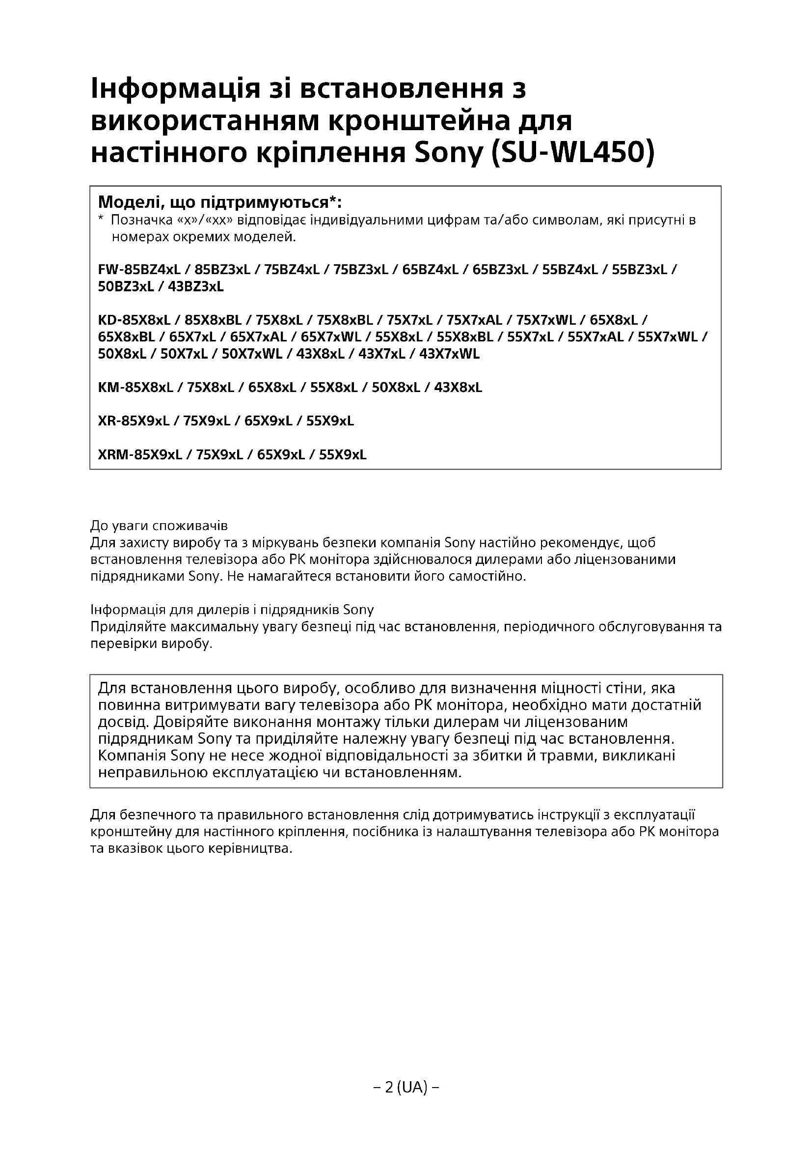 - Позначка «x»/«xx» відповідає індивідуальними цифрам та/або символам, які присутні в номерах окремих моделей. FW-85BZ4xL / 85BZ3xL / 75BZ4xL / 75BZ3xL / 65BZ4xL / 65BZ3xL / 55BZ4xL / 55BZ3xL / 50BZ3xL / 43BZ3xL KD-85X8xL / 85X8xBL / 75X8xL / 75X8xBL / 75X7xL / 75X7xAL / 75X7xWL / 65X8xL / 65X8xBL/ 65X7xL / 65X7xAL / 65X7xWL / 55X8xL / 55X8xBL / 55X7xL / 55X7xAL / 55X7xWL / 50X8xL / 50X7xL / 50X7xWL / 43X8xL / 43X7xL / 43X7xWL KM-85X8xL / 75X8xL / 65X8xL / 55X8xL / 50X8xL / 43X8xL XR-85X9xL / 75X9xL / 65X9xL / 55X9xL XRM-85X9xL / 75X9xL / 65X9xL / 55X9xL До уваги споживачів Для захисту виробу та з міркувань безпеки компанія Sony настійно рекомендує, щоб встановлення телевізора або РК монітора здійснювалося дилерами або ліцензованими підрядниками Sony. Не намагайтеся встановити його самостійно. Інформація для дилерів і підрядників Sony Приділяйте максимальну увагу безпеці під час встановлення, періодичного обслуговування та перевірки виробу. Для встановлення цього виробу, особливо для визначення міцності стіни, яка повинна витримувати вагу телевізора або РК монітора, необхідно мати достатній досвід. Довіряйте виконання монтажу тільки дилерам чи ліцензованим підрядникам Sony та приділяйте належну увагу безпеці під час встановлення. Компанія Sony не несе жодної відповідальності за збитки й травми, викликані неправильною експлуатацією чи встановленням. Для безпечного та правильного встановлення слід дотримуватись інструкції з експлуатації кронштейну для настінного кріплення, посібника із налаштування телевізора або РК монітора та вказівок цього керівництва.− 3 (UA) −