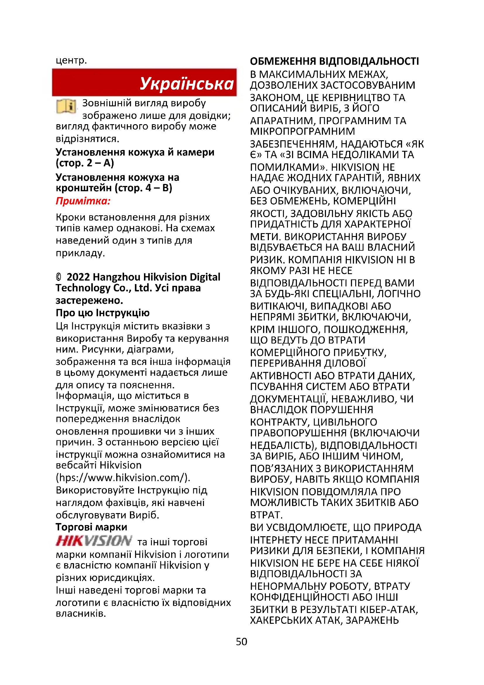 © 2022 Hangzhou Hikvision Digital Technology Co., Ltd. Усі права застережено. Про цю Інструкцію Ця Інструкція містить вказівки з використання Виробу та керування ним. Рисунки, діаграми, зображення та вся інша інформація в цьому документі надається лише для опису та пояснення. Інформація, що міститься в Інструкції, може змінюватися без попередження внаслідок оновлення прошивки чи з інших причин. З останньою версією цієї інструкції можна ознайомитися на вебсайті Hikvision (https://www.hikvision.com/). Використовуйте Інструкцію під наглядом фахівців, які навчені обслуговувати Виріб. Торгові марки та інші торгові марки компанії Hikvision і логотипи є власністю компанії Hikvision у різних юрисдикціях. Інші наведені торгові марки та логотипи є власністю їх відповідних