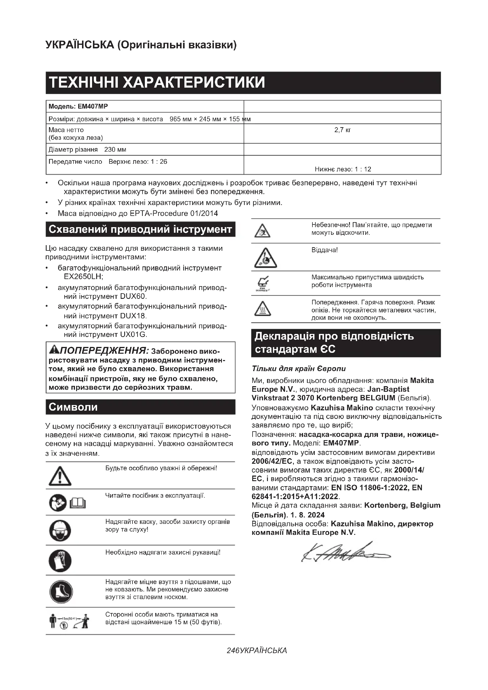 Максимальноприпустимашвидкість роботиінструмента Попередження.Гарячаповерхня.Ризик опіків.Неторкайтесяметалевихчастин, докивонинеохолонуть. Декларація про відповідність стандартам ЄС Тільки для країн Європи Ми,виробникицьогообладнання:компаніяMakita Europe N.V.,юридичнаадреса:Jan-Baptist Vinkstraat 2 3070 Kortenberg BELGIUM(Бельгія). УповноважуємоKazuhisa Makinoскластитехнічну документаціютапідсвоювиключнувідповідальність заявляємопроте,щовиріб; Позначення:насадка-косарка для трави, ножице- вого типу.Моделі:EM407MP. відповідаютьусімзастосовнимвимогамдирективи 2006/42/EC,атакожвідповідаютьусімзасто- совнимвимогамтакихдирективЄС,як2000/14/ EC,івиробляютьсязгіднозтакимигармонізо- ванимистандартами:EN ISO 11806-1:2022, EN 62841-1:2015+A11:2022. Місцейдатаскладаннязаяви:Kortenberg, Belgium (Бельгія). 1. 8. 2024 Відповідальнаособа:Kazuhisa Makino, директор компанії Makita Europe N.V.247 УКРАЇНСЬКА ПОПЕРЕДЖЕННЯ ПРО ДОТРИМАННЯ ТЕХНІКИ