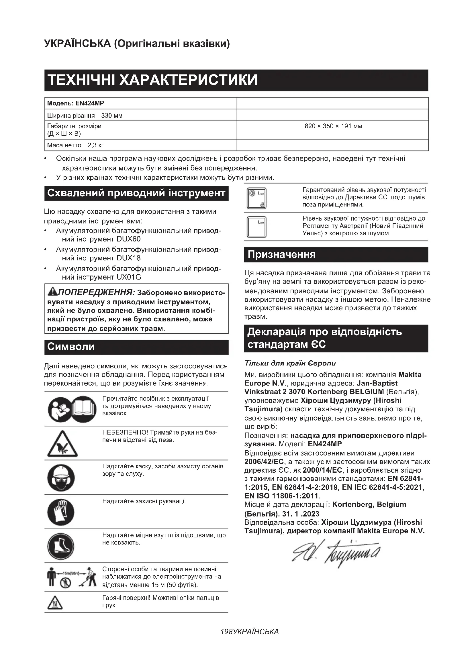 Позначення:насадка для приповерхневого підрі- зування.Моделі:EN424MP. Відповідаєвсімзастосовнимвимогамдирективи 2006/42/EC,атакожусімзастосовнимвимогамтаких директивЄС,як2000/14/EC,івиробляєтьсязгідно зтакимигармонізованимистандартами:EN 62841- 1:2015, EN 62841-4-2:2019, EN IEC 62841-4-5:2021, EN ISO 11806-1:2011. Місцейдатадекларації:Kortenberg, Belgium (Бельгія). 31. 1 .2023 Відповідальнаособа:Хіроши Цудзимура (Hiroshi Tsujimura), директор компанії Makita Europe N.V.199 УКРАЇНСЬКА ПОПЕРЕДЖЕННЯ ПРО ДОТРИМАННЯ ТЕХНІКИ