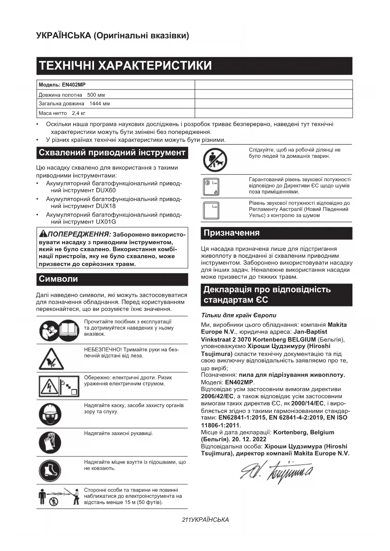 Позначення:пила для підрізування живоплоту. Моделі:EN402MP. Відповідаєусімзастосовнимвимогамдирективи 2006/42/EC,атакожвідповідаєусімзастосовним вимогамтакихдирективЄС,як2000/14/EC,івиро- бляєтьсязгіднозтакимигармонізованимистандар- тами:EN62841-1:2015, EN 62841-4-2:2019, EN ISO 11806-1:2011. Місцейдатадекларації:Kortenberg, Belgium (Бельгія). 20. 12. 2022 Відповідальнаособа:Хіроши Цудзимура (Hiroshi Tsujimura), директор компанії Makita Europe N.V.212 УКРАЇНСЬКА ПОПЕРЕДЖЕННЯ ПРО ДОТРИМАННЯ ТЕХНІКИ