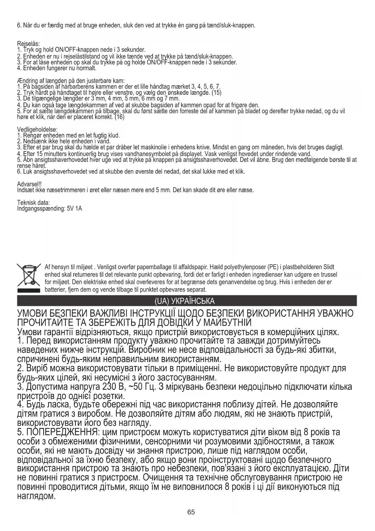 Не вставляйте тример для носа у вухо або ніс більше ніж на 5 мм. Це може пошкодити ваше вухо чи ніс. Технічні дані: Вхідна напруга: 5В 1А У інтересах навколишнього середовища. Будь ласка, віддайте картонну упаковку в місце збору мукулатури. Політиленові мішки (PE) викинути в смітник для пластику. Відпрацьований пристрій повинен бути відправлений у відповідну точку зберігання, тому що в пристрої є небезпечні інгредієнти, які можуть становити загрозу навколишньому середовищу. Електричний пристрій потрібно повернути так, щоб обмежити його повторне використання. Якщо у пристрої є батерейки, то потрібно їх витягнути і віддати до відповідного пунтку.68