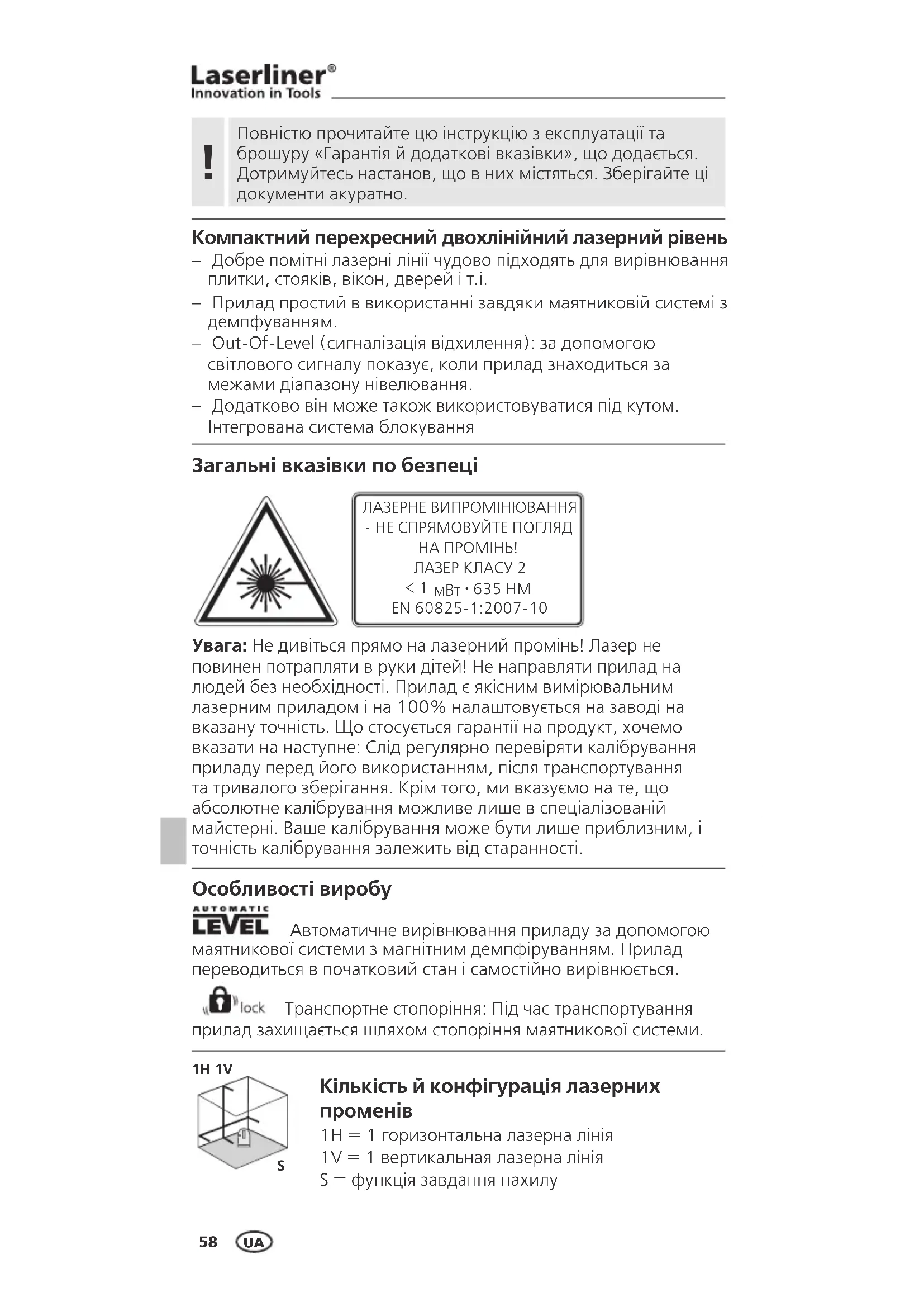 1H 1V Повністю прочитайте цю інструкцію з експлуатації та брошуру «Гарантія й додаткові вказівки», що додається. Дотримуйтесь настанов, що в них містяться. Зберігайте ці документи акуратно. !SuperCross-Laser Compact