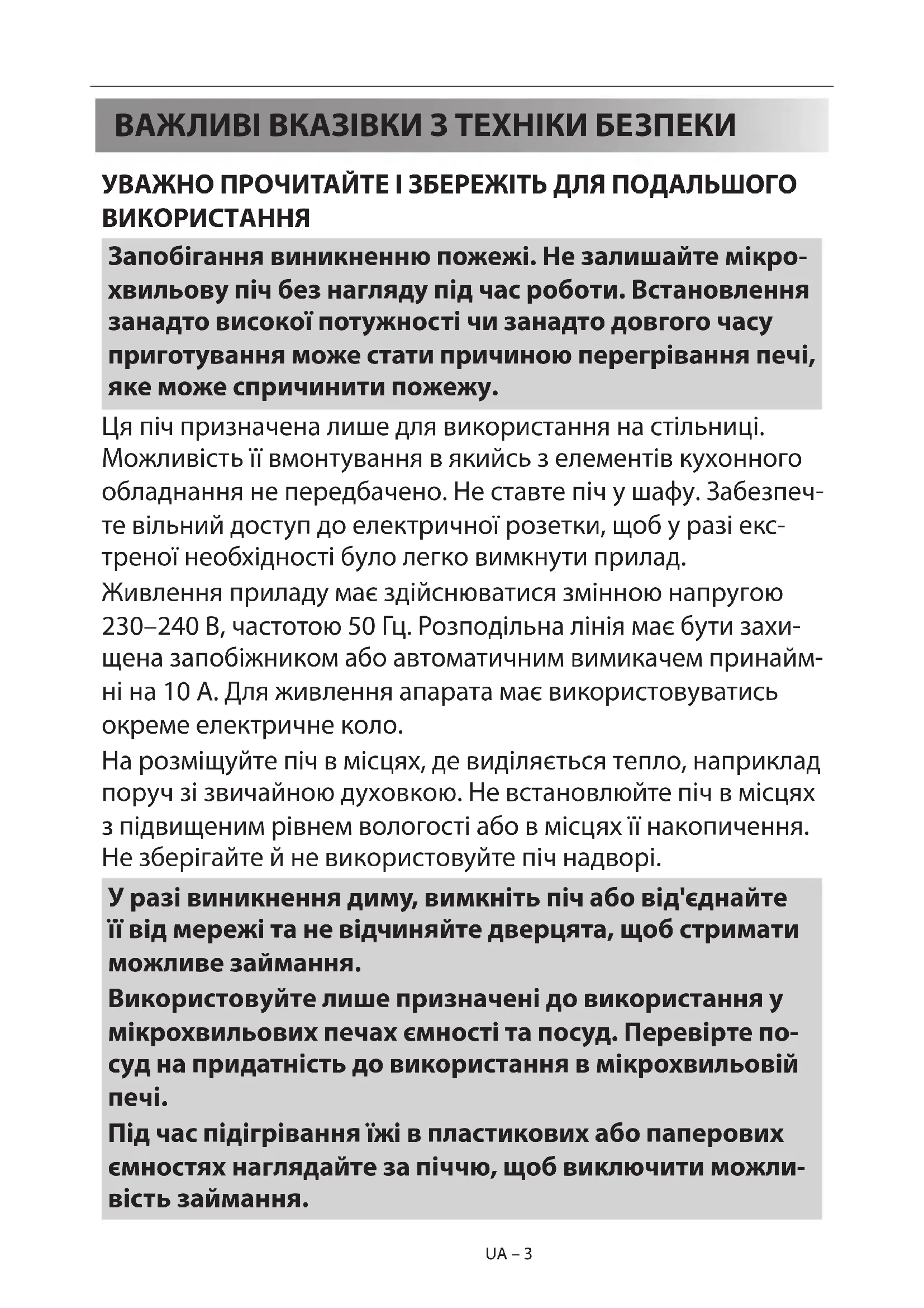 - ПЕРШ НІЖ ЗВЕРТАТИСЯ ПО ДОПОМОГУ UA – 3UA – 3 ВАЖЛИВІ ВКАЗІВКИ З ТЕХНІКИ БЕЗПЕКИ УВАЖНО ПРОЧИТАЙТЕ І ЗБЕРЕЖІТЬ ДЛЯ ПОДАЛЬШОГО ВИКОРИСТАННЯ Запобігання виникненню пожежі. Не залишайте мікро- хвильову піч без нагляду під час роботи. Встановлення занадто високої потужності чи занадто довгого часу приготування може стати причиною перегрівання печі, яке може спричинити пожежу. Ця піч призначена лише для використання на стільниці. Можливість її вмонтування в якийсь з елементів кухонного обладнання не передбачено. Не ставте піч у шафу. Забезпеч- те вільний доступ до електричної розетки, щоб у разі екс- треної необхідності було легко вимкнути прилад. Живлення приладу має здійснюватися змінною напругою 230–240 В, частотою 50 Гц. Розподільна лінія має бути захи- щена запобіжником або автоматичним вимикачем принайм- ні на 10 A. Для живлення апарата має використовуватись окреме електричне коло. На розміщуйте піч в місцях, де виділяється тепло, наприклад поруч зі звичайною духовкою. Не встановлюйте піч в місцях з підвищеним рівнем вологості або в місцях її накопичення. Не зберігайте й не використовуйте піч надворі. У разі виникнення диму, вимкніть піч або від'єднайте її від мережі та не відчиняйте дверцята, щоб стримати можливе займання. Використовуйте лише призначені до використання у мікрохвильових печах ємності та посуд. Перевірте по- суд на придатність до використання в мікрохвильовій p. 33