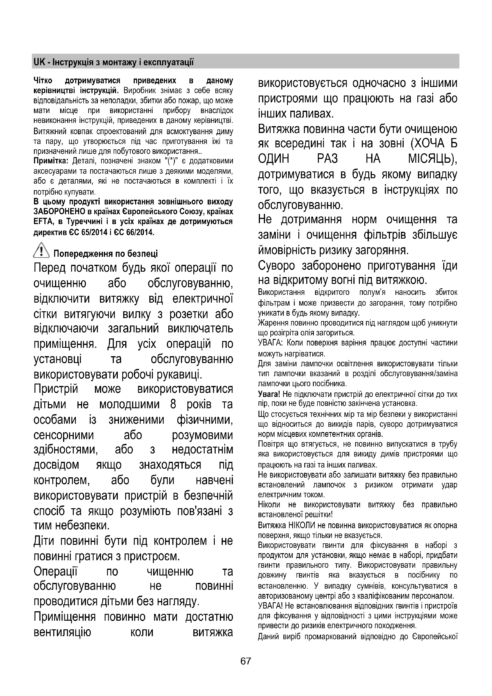 лампочки цього посібника. Увага! Не підключати пристрій до електричної сітки до тих пір, поки не буде повністю закінчена установка. Що стосується технічних мір та мір безпеки у використанні що відноситься до викидів парів, суворо дотримуватися норм місцевих компетентних органів. Повітря що втягується, не повинно випускатися в трубу яка використовується для викиду димів пристроями що працюють на газі та інших паливах. Не використовувати або залишати витяжку без правильно встановлений лампочок з ризиком отримати удар електричним током. Ніколи не використовувати витяжку без правильно встановленої решітки! Витяжка НІКОЛИ не повинна використовуватися як опорна поверхня, якщо тільки не вказується. Використовувати гвинти для фіксування в