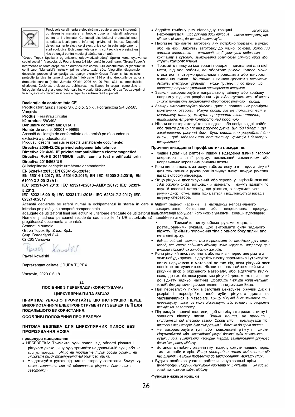 ПИЛА 58Г492 ПРИМІТКА: УВАЖНО ПРОЧИТАЙТЕ ЦЮ ІНСТРУКЦІЮ ПЕРЕД ВИКОРИСТАННЯМ ЕЛЕКТРОІНСТРУМЕНТУ І ЗБЕРЕЖІТЬ ЇЇ ДЛЯ ПОДАЛЬШОГО ВИКОРИСТАННЯ. ОСОБЛИВІ ПОЛОЖЕННЯ ПРО БЕЗПЕКУ