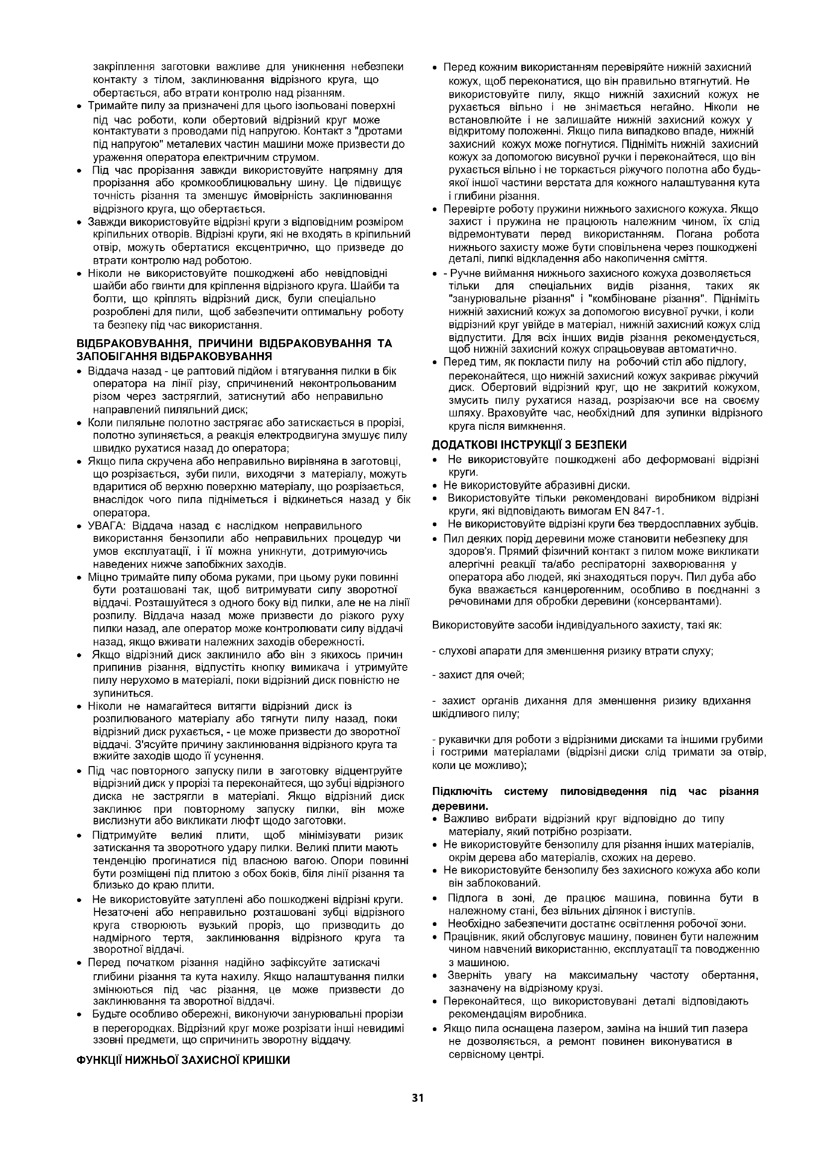 - Перед тим, як покласти пилу на робочий стіл або підлогу, переконайтеся, що нижній захисний кожух закриває ріжучий диск. Обертовий відрізний круг, що не закритий кожухом, змусить пилу рухатися назад, розрізаючи все на своєму шляху. Враховуйте час, необхідний для зупинки відрізного круга після вимкнення. ДОДАТКОВІ ІНСТРУКЦІЇ З БЕЗПЕКИ