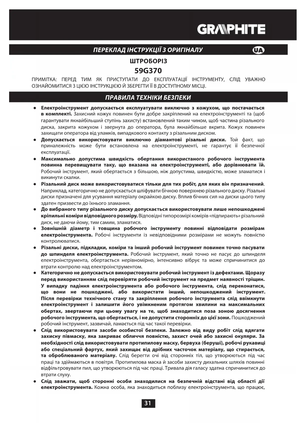 59G370 ПРИМІТКА: ПЕРЕД ТИМ ЯК ПРИСТУПАТИ ДО ЕКСПЛУАТАЦІЇ ІНСТРУМЕНТУ, СЛІД УВАЖНО ОЗНАЙОМИТИСЯ З ЦІЄЮ ІНСТРУКЦІЄЮ Й ЗБЕРЕГТИ ЇЇ В ДОСТУПНОМУ МІСЦІ. ПРАВИЛА ТЕХНІКИ БЕЗПЕКИ ● Електроінструмент допускається експлуатувати виключно з кожухом, що постачається в комплекті. Захисний кожух повинен бути добре закріплений на електроінструменті та (щоб гарантувати якнайбільший ступінь захисту) встановлений таким чином, щоб частина різального диска, закрита кожухом і звернута до оператора, була якнайбільше вкрита. Кожух повинен захищати оператора від уламків, випадкового контакту з різальним диском. ● Допускається використовувати виключно діамантові різальні диски. Той факт, що приналежність може бути встановлена на електроінструменті, не гарантує її безпечної експлуатації. ● Максимально допустима швидкість обертання використаного робочого інструмента повинна перевищувати таку, що вказана на електроінструменті, або дорівнювати їй. Робочий інструмент, який обертається з більшою, ніж допустима, швидкістю, може зламатися і викинути скалки. ● Різальний диск може використовуватися тільки для тих робіт, для яких він призначений. Наприклад, категорично не допускається шліфувати бічною поверхнею різального диску. Різальні диски призначені для усування матеріалу окрайкою диску. Вплив бічних сил на диски цього типу здатен призвести до їхнього зламання. ● До вибраного типу різального диску допускається використовувати лише непошкоджені кріпильні коміри відповідного розміру. Відповідні типорозмірі комірів «підпирають» різальний диск, не даючи йому, тим самим, зламатися. ● Зовнішній діаметр і товщина робочого інструменту повинні відповідати розмірам електроінструмента. Робочі інструменти із невідповідними розмірами не можуть повністю контролюватися. ● Різальні диски, підкладки, коміри та інший робочий інструмент повинен точно пасувати до шпинделя електроінструмента. Робочий інструмент, який точно не пасує до шпинделя електроінструмента, обертається нерівномірно, інтенсивно вібрує та може спричинитися до втрати контролю над електроінструментом. ● Категорично не допускається використовувати робочий інструмент із дефектами. Щоразу перед використанням слід перевіряти робочий інструмент на предмет наявності тріщин. У випадку падіння електроінструмента або робочого інструмента, слід переконатися, що вони не пошкоджені, або використати інший, непошкоджений інструмент. Після перевірки технічного стану та закріплення робочого інструмента слід ввімкнути електроінструмент і залишити його увімкненим протягом хвилини на максимальних обертах, звертаючи при цьому увагу на те, щоб знаходитися поза зоною досягнення робочого інструмента, що обертається, і не допустити сторонніх до цієї зони. Пошкоджений робочий інструмент, зазвичай, ламається під час такої перевірки. ● Слід використовувати засоби особистої безпеки. Залежно від виду робіт слід вдягати захисну півмаску, яка закриває обличчя повністю, захист очей або захисні окуляри. За необхідності слід використовувати протипилову маску, бервуха (беруші), робочі рукавиці або спеціальний фартух, який захищає від дрібних часточок матеріалу, що стирається, та оброблюваного матеріалу. Слід берегти очі від сторонніх тіл, що утворюються під час праці та здіймаються в повітря. Пр