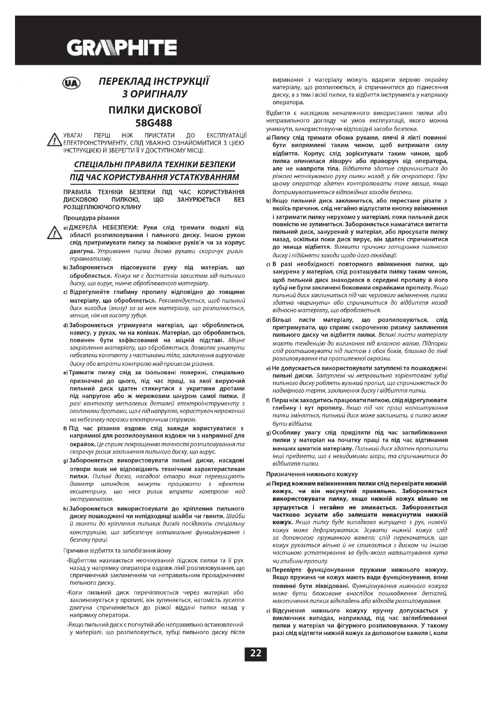 2ХХХ – год изготовления, YY – месяц изготовления G- код торговой марки (первая буква) ***** - порядковый номер изделия Изготовлено в КНР для GRUPA TOPEX Sp. z o.o. Sp. k., ul. Pograniczna 2/4, 02-285 Warszawa, Польша22 ПЕРЕКЛАД ІНСТРУКЦІЇ З ОРИГІНАЛУ ПИЛКИ ДИСКОВОЇ 58G488 УВАГА! ПЕРШ НІЖ ПРИСТАТИ ДО ЕКСПЛУАТАЦІЇ ЕЛЕКТРОІНСТРУМЕНТУ, СЛІД УВАЖНО ОЗНАЙОМИТИСЯ З ЦІЄЮ ІНСТРУКЦІЄЮ Й ЗБЕРЕГТИ ЇЇ У ДОСТУПНОМУ МІСЦІ. СПЕЦІАЛЬНІ ПРАВИЛА ТЕХНІКИ БЕЗПЕКИ ПІД ЧАС КОРИСТУВАННЯ УСТАТКУВАННЯМ ПРАВИЛА ТЕХНІКИ БЕЗПЕКИ ПІД ЧАС КОРИСТУВАННЯ ДИСКОВОЮ ПИЛКОЮ, ЩО ЗАНУРЮЄТЬСЯ БЕЗ РОЗЩЕПЛЮЮЧОГО КЛИНУ Процедура різання a) ДЖЕРЕЛА НЕБЕЗПЕКИ: Руки слід тримати подалі від області розпиловування і пильного диску. Іншою рукою слід притримувати пилку за поміжне руків’я чи за корпус двигуна. Утримання пилки двома руками скорочує ризик травматизму. b) Забороняється підсовувати руку під матеріал, що обробляється. Кожух не є достатнім захистом від пильного диску, що вирує, нижче оброблюваного матеріалу. c) Відрегулюйте глибину пропилу відповідно до товщини матеріалу, що обробляється. Рекомендується, щоб пильний диск виходив (знизу) за-за меж матеріалу, що розпилюється, менше, ніж на висоту зубця. d) Забороняється утримувати матеріал, що обробляється, навису, у руках, чи на колінах. Матеріал, що обробляється, повинен бути зафіксований на міцній підставі. Міцне закріплення матеріалу, що обробляється, дозволяє уникнути небезпеки контакту з частинами тіла, заклинення вируючого диску або втрати контролю над процесом різання. e) Тримати пилку слід за ізольовані поверхні, спеціально призначені до цього, під час праці, за якої вируючий пильний диск здатен стикнутися з укритими дротами під напругою або ж мережевим шнуром самої пилки. В разі контакту металевих деталей електроінструменту з оголеними дротами, що є під напругою, користувач наражений на небезпеку поразки електричним струмом. f) Під час різання вздовж слід завжди користуватися з напрямної для розпиловування вздовж чи з напрямної для окрайок. Це сприяє покращенню точності розпиловування та скорочує ризик заклинення пильного диску, що вирує. g) Забороняється використовувати пильні диски, насадові отвори яких не відповідають технічним характеристикам пилки. Пильні диски, насадові отвори яких перевищують діаметр шпинделя, можуть працювати з ефектом ексцентрику, що несе ризик втрати контролю над інструментом. h) Забороняється використовувати до кріплення пильного диску пошкоджені чи непідходящі шайби чи гвинти. Шайби й гвинти до кріплення пильних дисків посідають спеціальну конструкцію, що забезпечує оптимальне функціонування і безпеку праці. Причини відбиття та запобігання йому - Відбиттям називається неочікуваний підскок пилки та її рух назад у напрямку оператора вздовж лінії розпиловування, що спричинений заклиненням чи неправильним провадженням пильного диску. - Коли пильний диск перечіплюється через матеріал або заклиновується у пропилі, він зупиняється, натомість зусилля двигуна спричиняється до різкої віддачі пилки назад у напрямку оператора. - Якщо пильний диск є погнутий або неправильно встановлений у матеріалі, що розпиловується, зубці пильного диску після виринання з матеріалу можуть вдарити верхню окрайку матеріалу, що розпилюється, й спричинитися до піднесення диску, а з тим і всієї пилки, та відбиття інструмента у напр