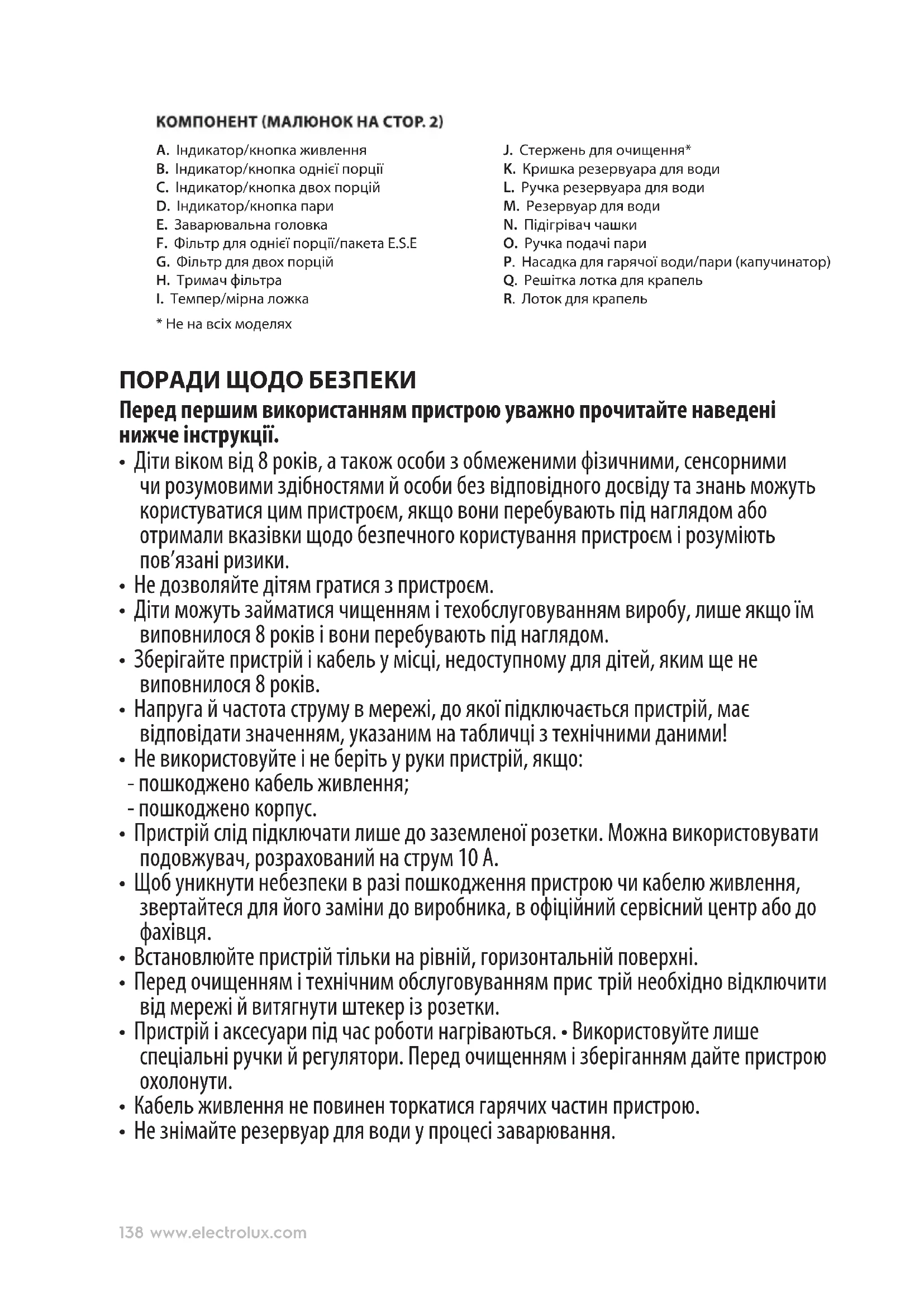 J. Стержень для очищення* K. Кришка резервуара для води L. Ручка резервуара для води M. Резервуар для води N. Підігрівач чашки O. Ручка подачі пари P. Насадка для гарячої води/пари (капучинатор) Q. Решітка лотка для крапель R. Лоток для крапель
