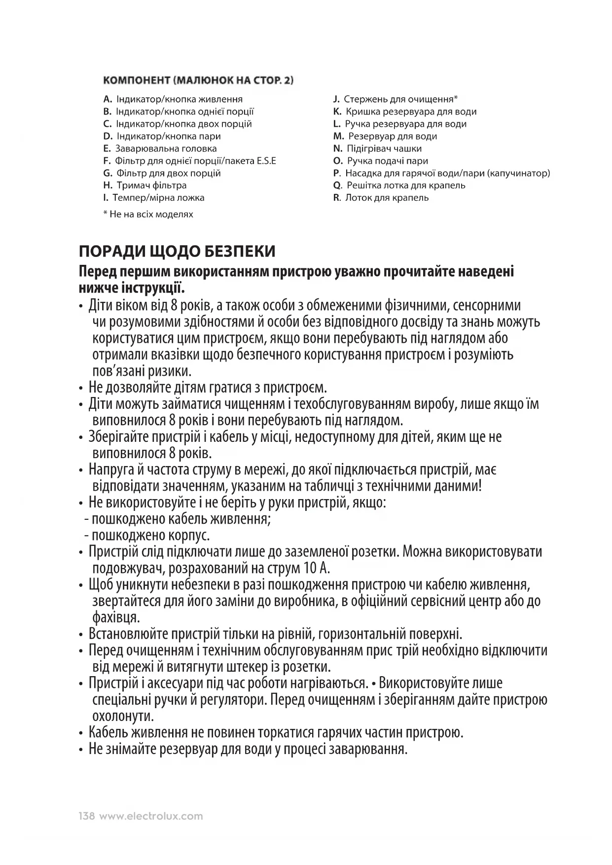 J. Стержень для очищення* K. Кришка резервуара для води L. Ручка резервуара для води M. Резервуар для води N. Підігрівач чашки O. Ручка подачі пари P. Насадка для гарячої води/пари (капучинатор) Q. Решітка лотка для крапель R. Лоток для крапель