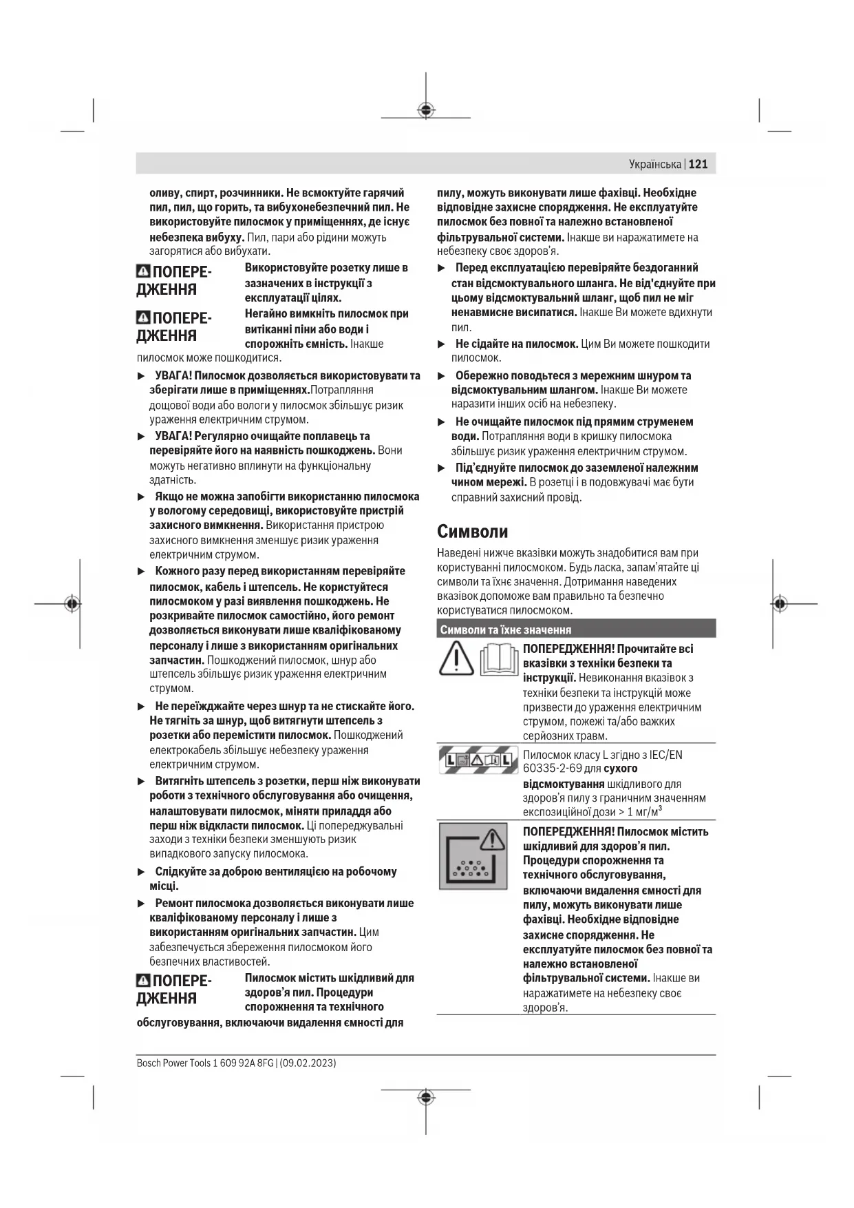 Bosch Power Tools 1 609 92A 8FG | (09.02.2023)122 | Українська Опис продукту і послуг Прочитайте всі застереження і вказівки. Невиконання вказівок з техніки безпеки та інструкцій може призвести до ураження електричним струмом, пожежі та/ або важких серйозних травм. Будь ласка, дотримуйтеся ілюстрацій на початку інструкції з експлуатації. Призначення приладу Пилосмок призначений для збирання, всмоктування, переміщення та відокремлення негорючого сухого пилу, негорючих рідин та водно-повітряної суміші. Відсмоктувач пройшов перевірку на предмет збирання пилу і відповідає класу пилу L. Він придатний для підвищених навантажень при професійному використанні, напр., для ремісницьких робіт, промисловості і майстерень. Пилосмок для пилу класу L згідно з IEC/EN60335-2-69 дозволено використовувати лише для всмоктування і відсмоктування шкідливого для здоров’я пилу з граничним значенням експозиційної дози >1мг/м³. Використовуйте відсмоктувач лише у тому випадку, якщо всі функції знаходяться у Вас повністю під контролем і Ви не вбачаєте обмежень в їх використанні або отримали відповідні вказівки. Під час експлуатації можна використовувати розетку лише у сухому середовищі. Зображені компоненти Нумерація зображених компонентів посилається на зображення пилосмока на сторінках з малюнками. (1)