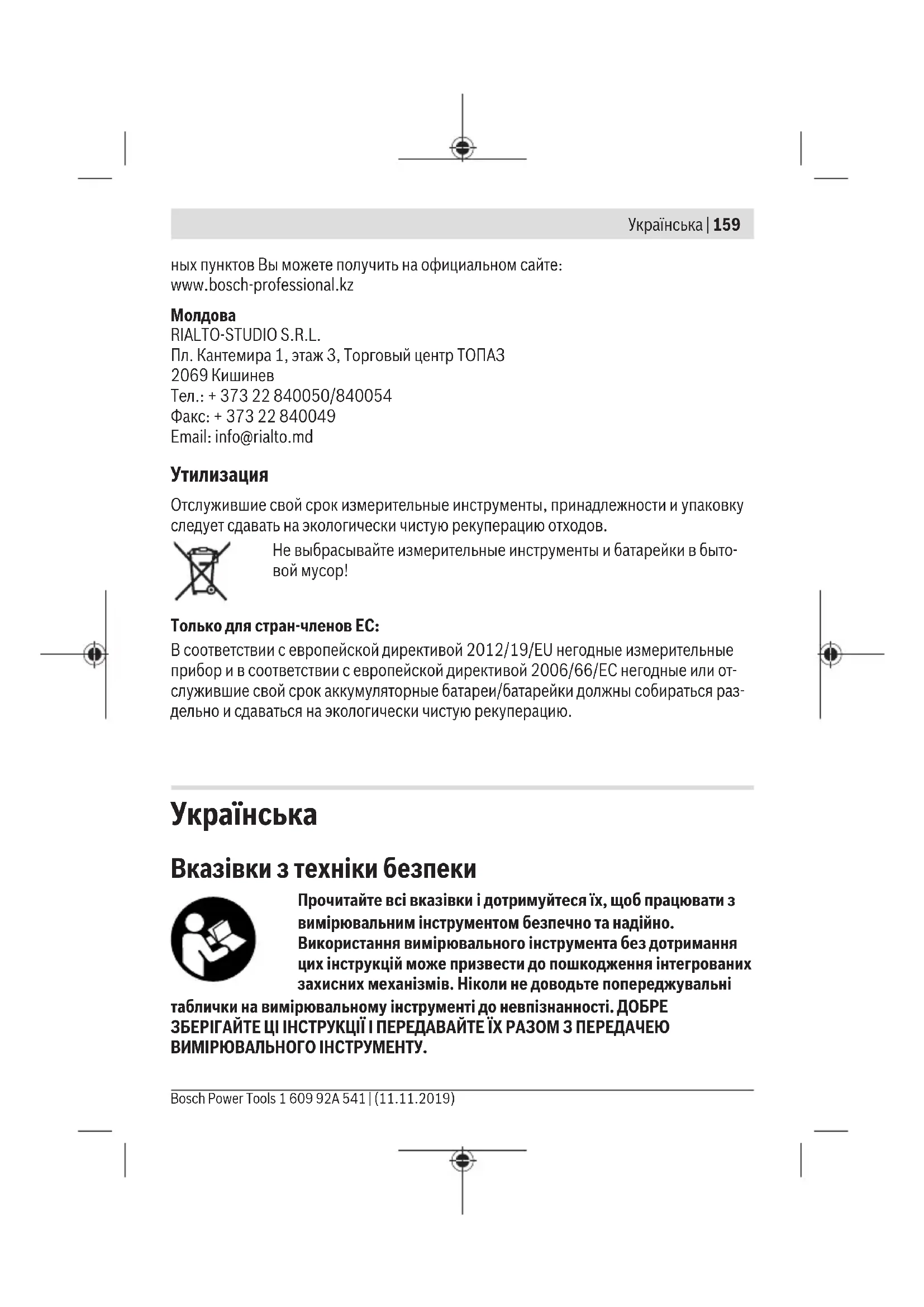 Лише для країнЄС: Відповідно до європейської директиви 2012/19/EU вимірювальні інструменти, що вийшли із вживання, та відповідно до європейської директиви 2006/66/EC пошкоджені або відпрацьовані акумуляторні батареї/батарейки повинні здаватися окремо і утилізуватися екологічно чистим способом.