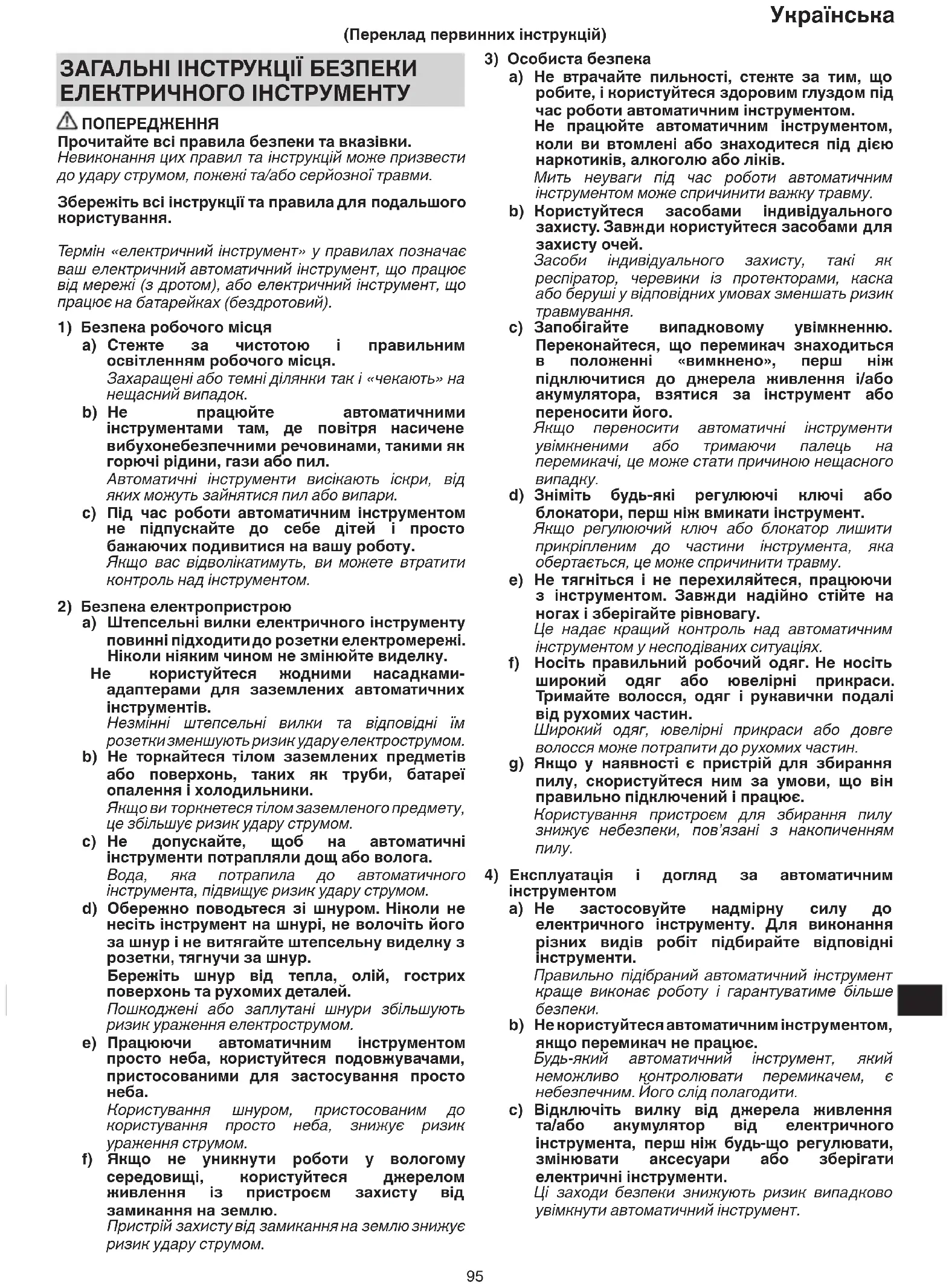 b) Не користуйтеся автоматичним інструментом, якщо перемикач не працює. Будь-який автоматичний інструмент, який неможливо контролювати перемикачем, є небезпечним. Його слід полагодити. c) Відключіть вилку від джерела живлення та/або акумулятор від електричного інструмента, перш ніж будь-що регулювати, змінювати аксесуари або зберігати електричні інструменти. Ці заходи безпеки знижують ризик випадково увімкнути автоматичний інструмент. ЗАГАЛЬНІ ІНСТРУКЦІЇ БЕЗПЕКИ ЕЛЕКТРИЧНОГО ІНСТРУМЕНТУ ПОПЕРЕДЖЕННЯ Прочитайте всі правила безпеки та вказівки. Невиконання цих правил та інструкцій може призвести до удару струмом, пожежі та/або серйозної травми. Збережіть всі інструкції та правила для подальшого користування. Термін «електричний інструмент» у правилах позначає ваш електричний автоматичний інструмент, що працює від мережі (з дротом), або електричний інструмент, що