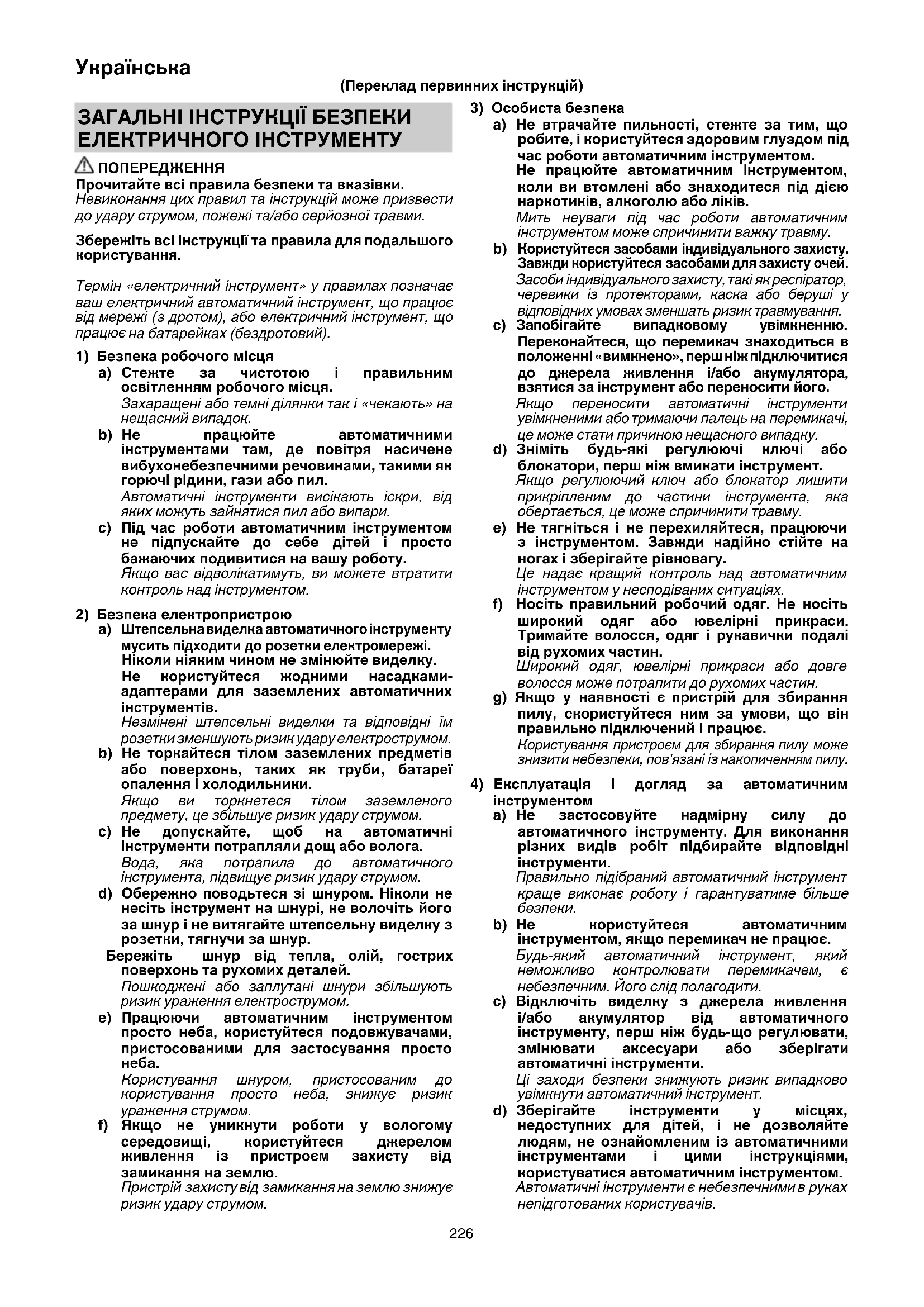 b) Не користуйтеся автоматичним інструментом, якщо перемикач не працює. Будь-який автоматичний інструмент, який неможливо контролювати перемикачем, є небезпечним. Його слід полагодити. c) Відключіть виделку з джерела живлення і/або акумулятор від автоматичного інструменту, перш ніж будь-що регулювати, змінювати аксесуари або зберігати автоматичні інструменти. Ці заходи безпеки знижують ризик випадково увімкнути автоматичний інструмент. d) Зберігайте інструменти у місцях, недоступних для дітей, і не дозволяйте людям, не ознайомленим із автоматичними інструментами і цими інструкціями, користуватися автоматичним інструментом. Автоматичні інструменти є небезпечними в руках непідготованих користувачів. ЗАГАЛЬНІ ІНСТРУКЦІЇ БЕЗПЕКИ ЕЛЕКТРИЧНОГО ІНСТРУМЕНТУ ПОПЕРЕДЖЕННЯ Прочитайте всі правила безпеки та вказівки. Невиконання цих правил та інструкцій може призвести до удару струмом, пожежі та/або серйозної травми. Збережіть всі інструкції та правила для подальшого користування. Термін «електричний інструмент» у правилах позначає ваш електричний автоматичний інструмент, що працює від мережі (з дротом), або електричний інструмент, що