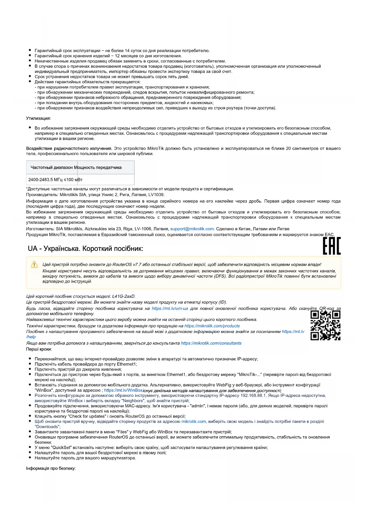 У меню "QuickSet" встановіть наступне: виберіть свою країну, щоб застосувати налаштування регулювання країни; Налаштуйте пароль для вашої бездротової мережі в лівому полі; Налаштуйте пароль для вашого маршрутизатора. Інформація про безпеку: Цей пристрій потрібно оновити до RouterOS v7.7 або останньої стабільної версії, щоб забезпечити відповідність місцевим нормам влади! Кінцеві користувачі несуть відповідальність за дотримання місцевих правил, включаючи функціонування в межах законних частотних каналів, вихідну потужність, вимоги до кабелів та вимоги щодо вибору динамічної частоти (DFS). Всі радіопристрої MikroTik повинні бути встановлені відповідно до інструкцій.Перш ніж працювати з будь-яким обладнанням MikroTik, усвідомте небезпеку, пов’язану з електричними схемами, і ознайомтеся зі стандартними методами запобігання нещасним випадкам. Особа, що виконує роботи зі встановлення устаткування мусить бути ознайомлена із правилами роботи з мережевими системами, термінами та концепціями. Використовуйте тільки адаптер електроживлення та аксесуари, затверджені виробником, та які можна знайти в оригінальній упаковці цього виробу. Це обладнання має встановлювати навчений та кваліфікований персонал відповідно до цих інструкцій зі встановлення. Особа, що виконує роботи зі встановлення устаткування несе відповідальність за те, щоб встановлення обладнання відповідало місцевим і національним електричним нормам. Не намагайтеся розібрати, відремонтувати чи модифікувати пристрій. Це обладнання призначене для встановлення в приміщенні. Тримайте це обладнання подалі від води, вогню, вологи, або гарячого середовища. Ми не можемо гарантувати відсутність нещасних випадків або пошкоджень через неправильне використання пристрою. Використовуйте цей продукт обережно та на свій страх і ризик! У разі збою пристрою відключіть його від живлення. Найшвидший спосіб зробити це - від'єднати адаптер живлення від електричної розетки. Адаптер повинен бути встановлений поблизу обладнання та бути легко доступним. Вплив радіочастотного випромінювання:Це обладнання MikroTik відповідає нормам радіаційного опромінення Європейського Союзу, встановленим для неконтрольованого середовища. Цей пристрій MikroTik слід встановлювати та експлуатувати не ближче 20 сантиметрів від вашого тіла, професіонала чи широкого загалу. Виробник: Mikrotikls SIA, Unijas 2, Рига, Латвія, LV1039. Робоча частота (Максимальна вихідна потужність): .2400-2483.5 МГц (20 дБм) Federal Communication Commission Interference Statement Model FCC ID L41G-2axD