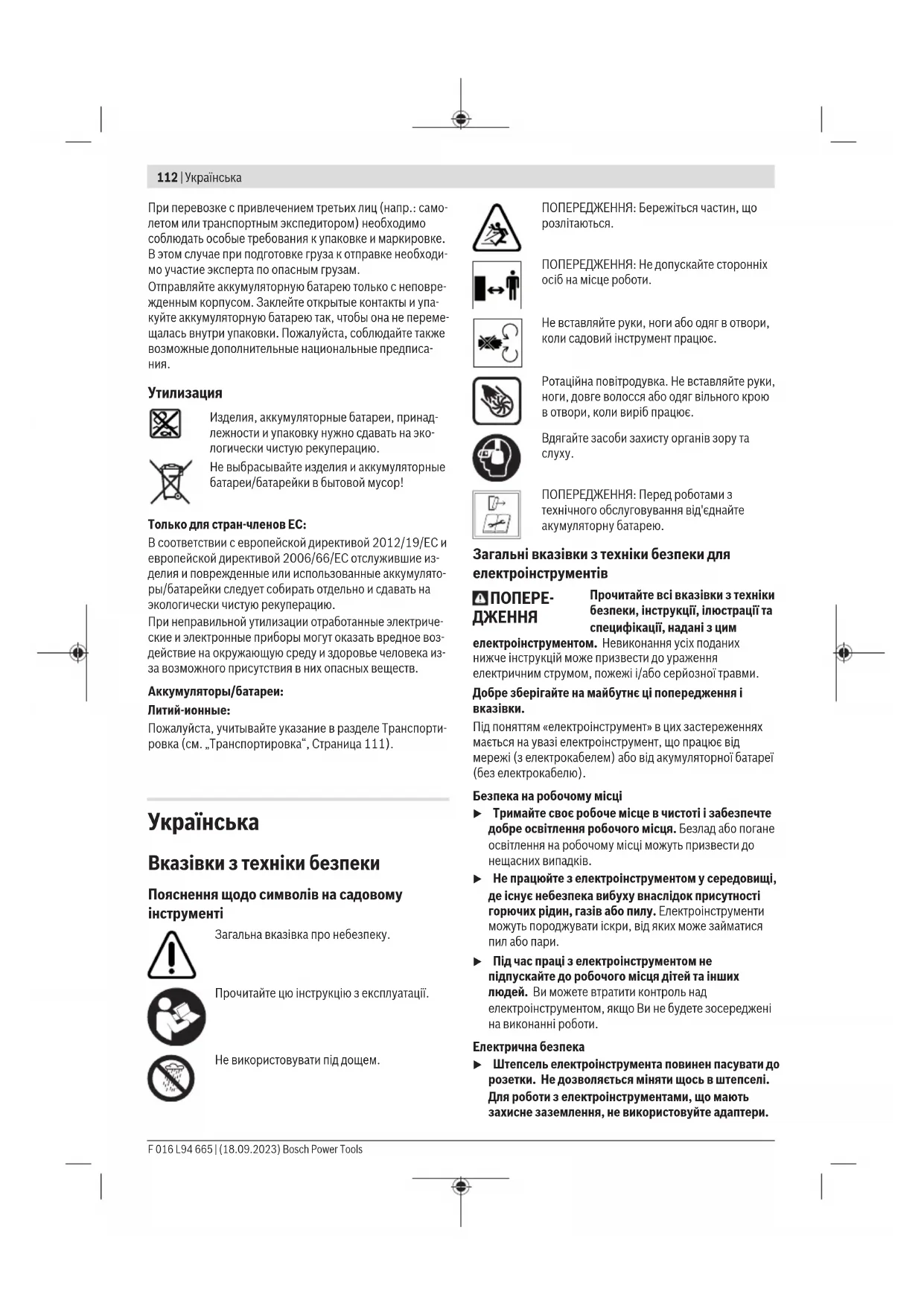 u Ніколи не обслуговуйте пошкоджені акумулятори. Обслуговувати акумулятори дозволяється лише виробнику або авторизованим сервісним організаціям. Вказівки з техніки безпеки для садових повітродувок u Не використовуйте садовий інструмент за поганих погодних умов, зокрема якщо насувається гроза. Це зменшує ризик ураження блискавкою. u Вдягайте навушники і захисні окуляри. Відповідні засоби індивідуального захисту зменшують ризик отримання травм. u Під час роботи із садовим інструментом завжди носіть нековзке захисне взуття. Не працюйте із садовими інструментом босоніж або у відкритих сандалях. Це зменшує небезпеку травмування стоп. u Не носіть просторий одяг або аксесуари, як-от шарфи, намиста, ланцюжки, краватки тощо, які можуть бути затягнуті у вентиляційні щілини. Покривайте довге волосся або зав’язуйте його позаду, щоб воно не потрапило у вентиляційні щілини. У разі затягування цих предметів у вентиляційні щілини може підвищитися ризик отримання травм. u Під час роботи із садовим інструментом не підпускайте до робочого місця інших осіб. Відкинутий зрізаний матеріал може підвищити ризик отримання травм. u Ніколи не спрямовуйте сопло повітродувки на людей, домашніх тварин або у напрямку вікон. Будьте особливо обережні під час використання повітродувки поблизу твердих об’єктів, як-от дерев, автомобілів та стін, оскільки предмети, що здуваються, можуть від них відскочити. Відкинуті предмети можуть пошкодити майно та підвищити ризик отримання травм. u Не використовуйте садовий інструмент для здування предметів, що горять або димлять, як-от цигарок, сірників або гарячого попелу. Ці джерела займання можуть підвищити ризик пожежі. u Не торкайтеся вентилятора, поки він ще рухається. Вимкніть електроінструмент і зачекайте, поки повітродувка повністю не зупиниться. Витягайте штепсель з розетки перед видаленням об’єктів, що блокують повітродувку. Це зменшує небезпеку травмування рухомими частинами. F 016 L94 665 | (18.09.2023) Bosch Power ToolsУкраїнська | 115 u Переконайтеся, що всі вимикачі вимкнені, коли видаляєте зрізаний матеріал, що застряг, або обслуговуєте садовий інструмент. Несподіване увімкнення садового інструмента під час видалення зрізаного матеріалу, що застряг, або робіт з технічного обслуговування може підвищити ризик отримання важких травм. Додаткові вказівки з техніки безпеки u Не використовуйте виріб поблизу гарячих, займистих або вибухонебезпечних матеріалів. Не здувайте сніг або інші предмети, які можуть перетворитися на уражаючі елементи, що розлітаються. Не використовуйте повітродувку у якості приводів для транспортних засобів (напр., скейтборду). u Після вимкнення садовий інструмент має ще інерційний вибіг тривалістю в декілька секунд (повітряний потік ще триває). Дайте двигуну зупинитися, перед тим як знову його вмикати. Не вмикайте садовий інструмент одразу після