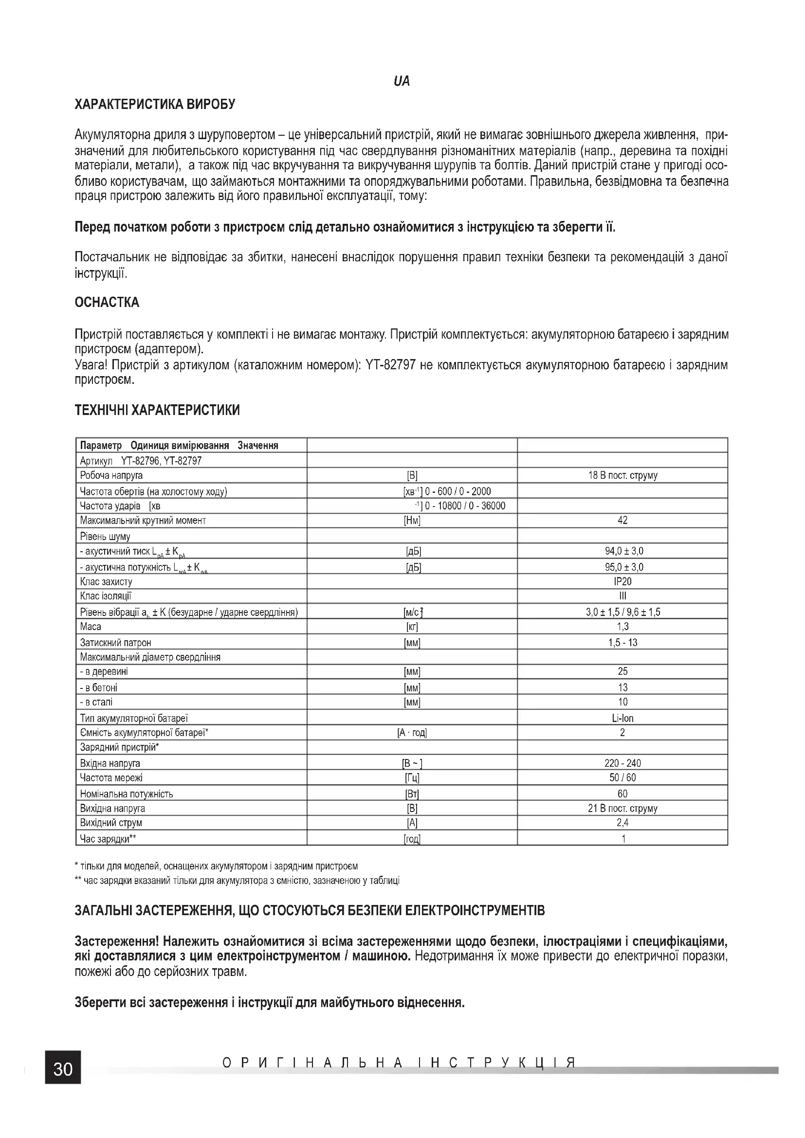- тільки для моделей, оснащених акумулятором і зарядним пристроєм ** час зарядки вказаний тільки для акумулятора з ємністю, зазначеною у таблиці ЗАГАЛЬНІ ЗАСТЕРЕЖЕННЯ, ЩО СТОСУЮТЬСЯ БЕЗПЕКИ ЕЛЕКТРОІНСТРУМЕНТІВ Застереження! Належить ознайомитися зі всіма застереженнями щодо безпеки, ілюстраціями і специфікаціями, які доставлялися з цим електроінструментом / машиною. Недотримання їх може привести до електричної поразки, пожежі або до серйозних травм. Зберегти всі застереження і інструкції для майбутнього віднесення.31 ОРИГІНАЛЬНА ІНСТРУКЦІЯ