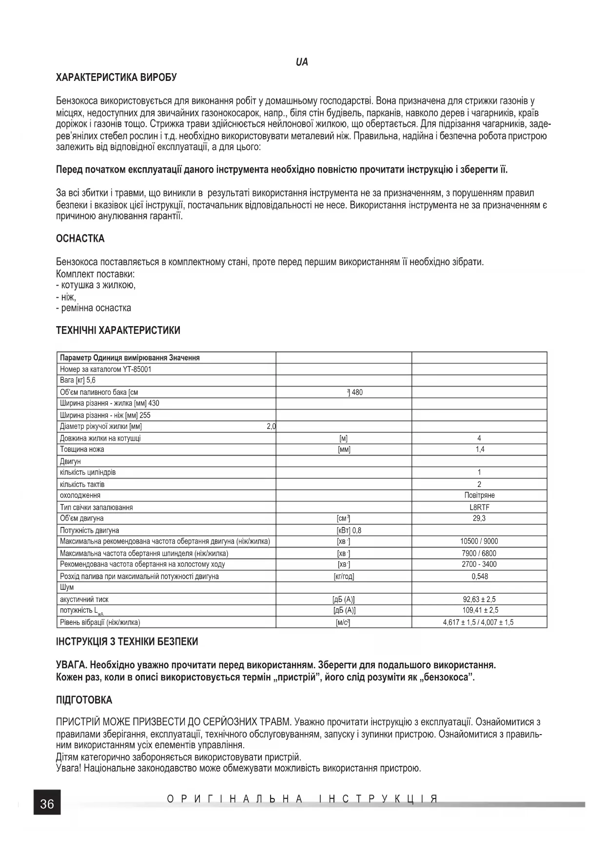 ] 4,617 ± 1,5 / 4,007 ± 1,5 ІНСТРУКЦІЯ З ТЕХНІКИ БЕЗПЕКИ УВАГА. Необхідно уважно прочитати перед використанням. Зберегти для подальшого використання. Кожен раз, коли в описі використовується термін „пристрій”, його слід розуміти як „бензокоса”.
