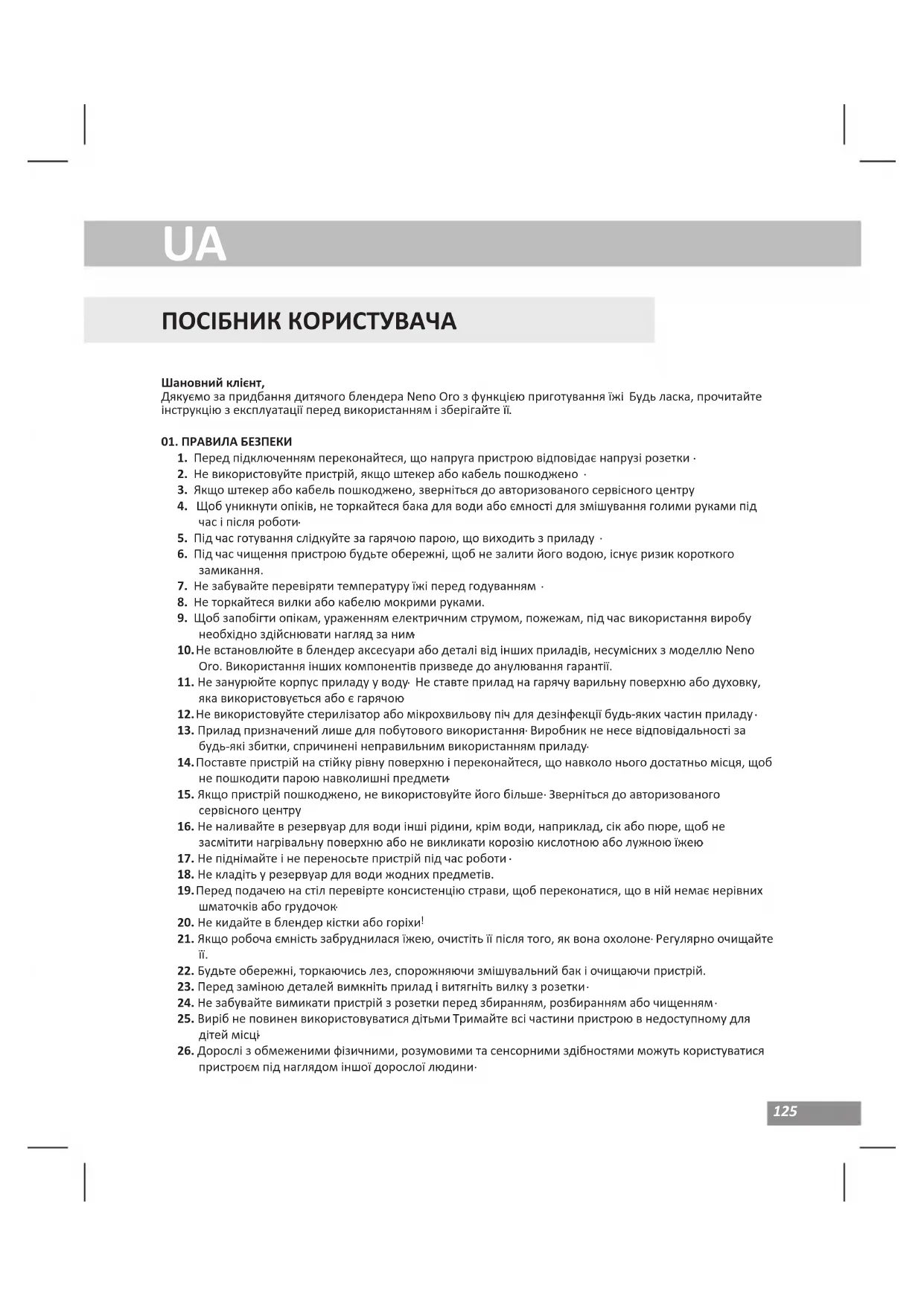 ПОСІБНИК КОРИСТУВАЧА Шановний клієнт, Дякуємо за придбання дитячого блендера Neno Oro з функцією приготування їжі