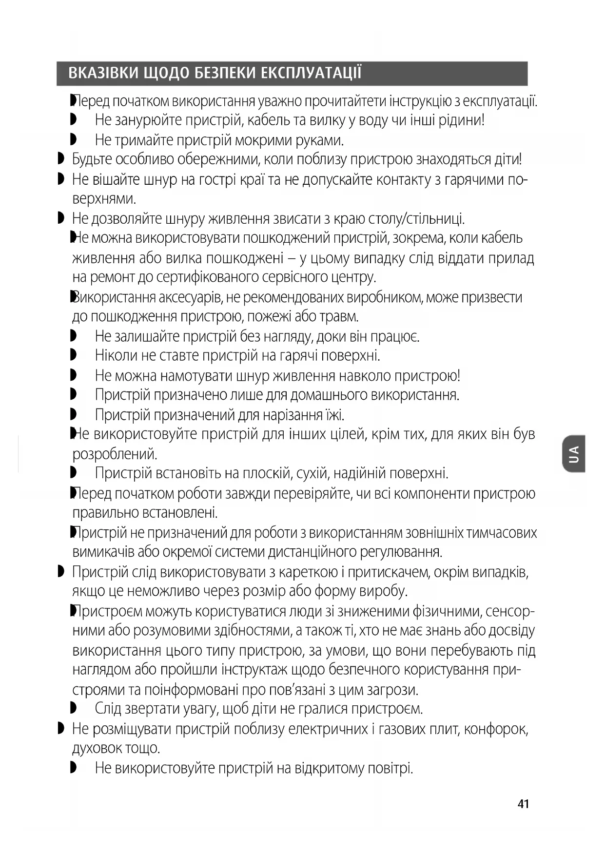 Пристроєм можуть користуватися люди зі зниженими фізичними, сенсор- ними або розумовими здібностями, а також ті, хто не має знань або досвіду використання цього типу пристрою, за умови, що вони перебувають під наглядом або пройшли інструктаж щодо безпечного користування при- строями та поінформовані про пов’язані з цим загрози. Слід звертати увагу, щоб діти не гралися пристроєм. Не розміщувати пристрій поблизу електричних і газових плит, конфорок, духовок тощо. Не використовуйте пристрій на відкритому повітрі.42