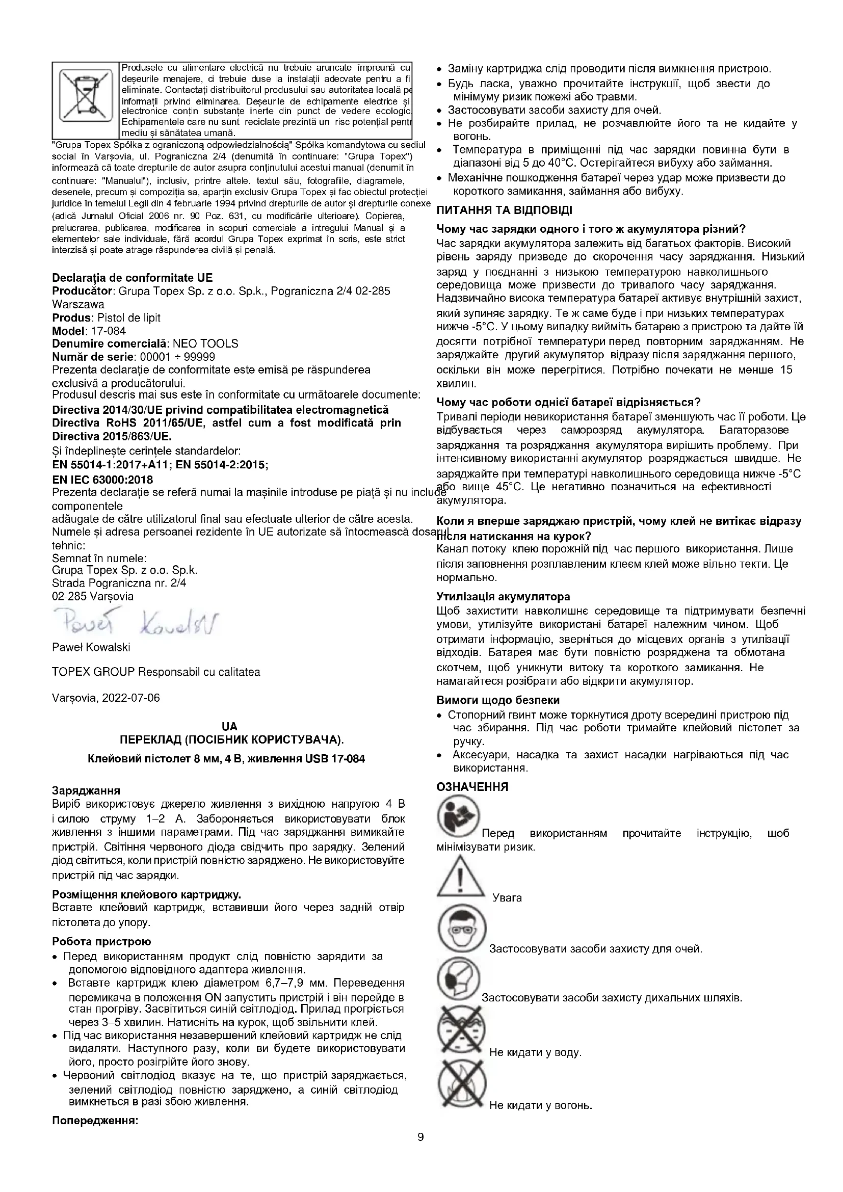 Вироби з електроживленням не можна викидати разом із побутовим сміттям, а слід утилізувати у відповідних місцях. Інформацію про утилізацію можна отримати у продавця продукту або в місцевих органах влади. Зужиті електричні та електронні пристрої містять речовини, які не є нейтральними для навколишнього середовища. Обладнання, яке не перероблено, становить потенційну загрозу для навколишнього середовища та здоров’я людей. Командитне товариство «Grupa Topex Spółka z ograniczoną odpowiedzialnością» з місцезнаходженням у Варшаві, вул. Погранічна, 2/4 (далі: «Grupa Topex») інформує, що всі авторські права на вміст даної інструкції (далі: «Інструкція»), зокрема на текст, розміщені фотографії, схеми, малюнки, а також її макет, належать виключно Grupa Topex і охороняються законом відповідно до закону від 4 лютого 1994 року «Про авторське право та суміжні права» (єдиний текст Журнал законів 2006 Номер 90 Пункт 631 зі змінами). Копіювання, обробка, публікація та модифікація в комерційних цілях усього Посібника та його окремих елементів без письмової згоди Grupa Topex суворо заборонена та може призвести до цивільної та кримінальної відповідальності. Декларація відповідності ЄС Виробник: Grupa Topex Sp. z o.o. Sp.k., Pograniczna 2/4 02-285 Warszawa Продукт: Клейовий пістолет Модель: 17-084 Торгова назва: NEO TOOLS Серійний номер: 00001 ÷ 99999 Дана декларація про відповідність видається під одноосібну відповідальність виробника. Продукт, описаний вище, відповідає наступним документам: Директива про електромагнітну сумісність 2014/30/ЄС Директива RoHS 2011/65/ЄС зі змінами, внесеними Директивою 2015/863/ЄС І відповідає вимогам стандартів: EN 55014-1:2017+A11; EN 55014-2:2015; EN IEC 63000:2018 Ця декларація відноситься тільки до техніки, яка представлена в обігу, і не включає комплектуючі доданий кінцевим користувачем або здійснений ним/нею згодом. Ім'я та адреса особи-резидента ЄС, уповноваженої на підготовку технічного