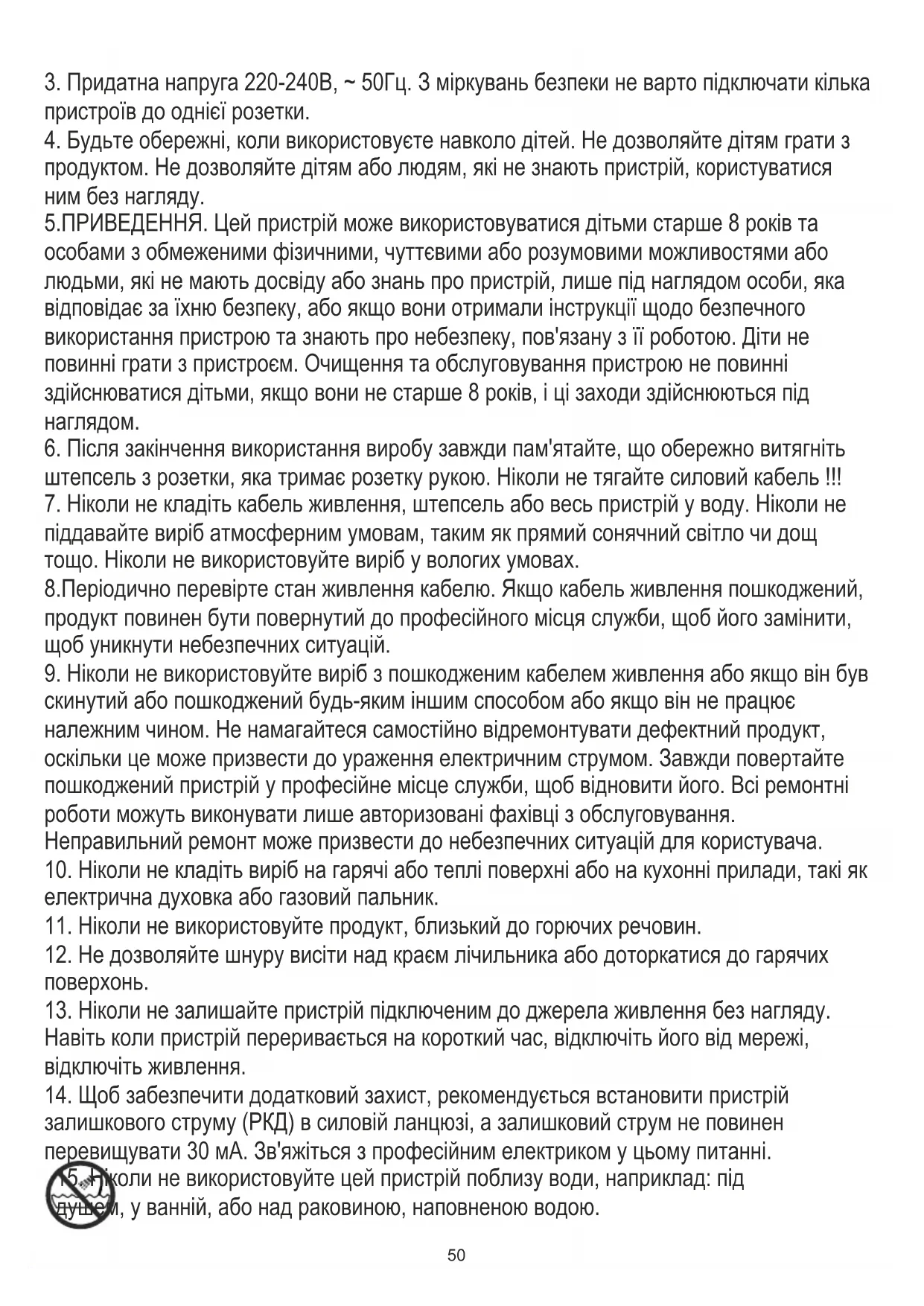 15. Ніколи не використовуйте цей пристрій поблизу води, наприклад: під