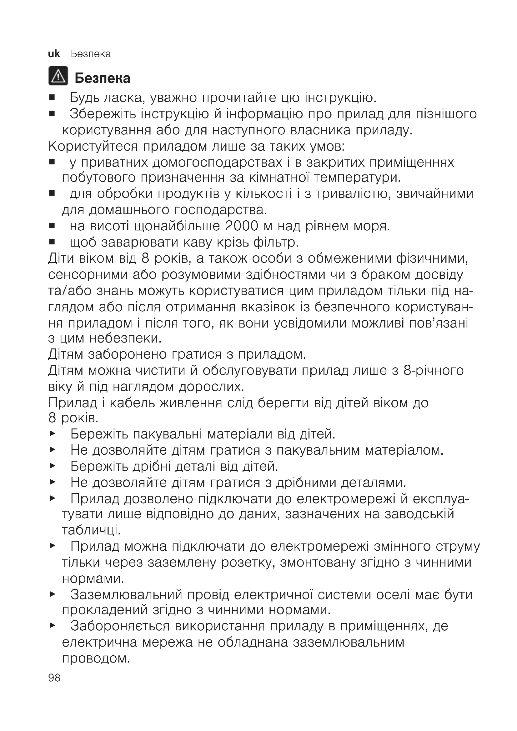 ¡ Будь ласка, уважно прочитайте цю інструкцію. ¡ Збережіть інструкцію й інформацію про прилад для пізнішого користування або для наступного власника приладу. Користуйтеся приладом лише за таких умов: ¡ у приватних домогосподарствах і в закритих приміщеннях побутового призначення за кімнатної температури. ¡ для обробки продуктів у кількості і з тривалістю, звичайними для домашнього господарства. ¡ на висоті щонайбільше 2000м над рівнем моря. ¡ щоб заварювати каву крізь фільтр. Діти віком від 8років, а також особи з обмеженими фізичними, сенсорними або розумовими здібностями чи з браком досвіду та/або знань можуть користуватися цим приладом тільки під на- глядом або після отримання вказівок із безпечного користуван- ня приладом і після того, як вони усвідомили можливі пов’язані з цим небезпеки. Дітям заборонено гратися з приладом. Дітям можна чистити й обслуговувати прилад лише з 8-річного віку й під наглядом дорослих. Прилад і кабель живлення слід берегти від дітей віком до 8років. ▶ Бережіть пакувальні матеріали від дітей. ▶ Не дозволяйте дітям гратися з пакувальним матеріалом. ▶ Бережіть дрібні деталі від дітей. ▶ Не дозволяйте дітям гратися з дрібними деталями. ▶ Прилад дозволено підключати до електромережі й експлуа- тувати лише відповідно до даних, зазначених на заводській