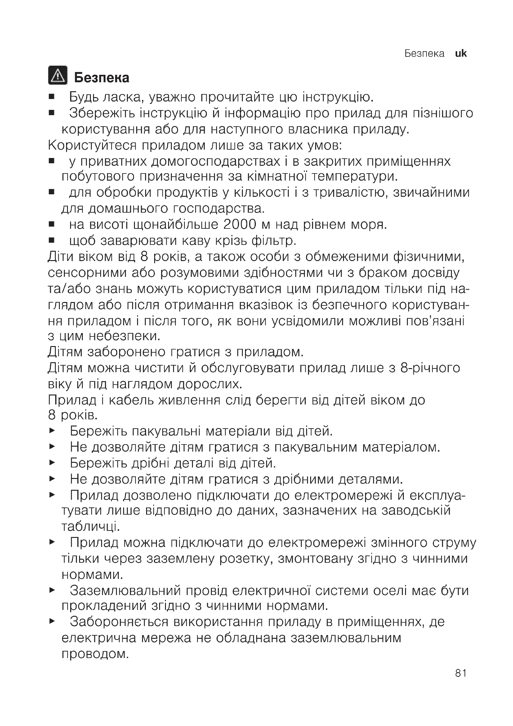 ¡ Будь ласка, уважно прочитайте цю інструкцію. ¡ Збережіть інструкцію й інформацію про прилад для пізнішого користування або для наступного власника приладу. Користуйтеся приладом лише за таких умов: ¡ у приватних домогосподарствах і в закритих приміщеннях побутового призначення за кімнатної температури. ¡ для обробки продуктів у кількості і з тривалістю, звичайними для домашнього господарства. ¡ на висоті щонайбільше 2000м над рівнем моря. ¡ щоб заварювати каву крізь фільтр. Діти віком від 8років, а також особи з обмеженими фізичними, сенсорними або розумовими здібностями чи з браком досвіду та/або знань можуть користуватися цим приладом тільки під на- глядом або після отримання вказівок із безпечного користуван- ня приладом і після того, як вони усвідомили можливі пов’язані з цим небезпеки. Дітям заборонено гратися з приладом. Дітям можна чистити й обслуговувати прилад лише з 8-річного віку й під наглядом дорослих. Прилад і кабель живлення слід берегти від дітей віком до 8років. ▶ Бережіть пакувальні матеріали від дітей. ▶ Не дозволяйте дітям гратися з пакувальним матеріалом. ▶ Бережіть дрібні деталі від дітей. ▶ Не дозволяйте дітям гратися з дрібними деталями. ▶ Прилад дозволено підключати до електромережі й експлуа- тувати лише відповідно до даних, зазначених на заводській