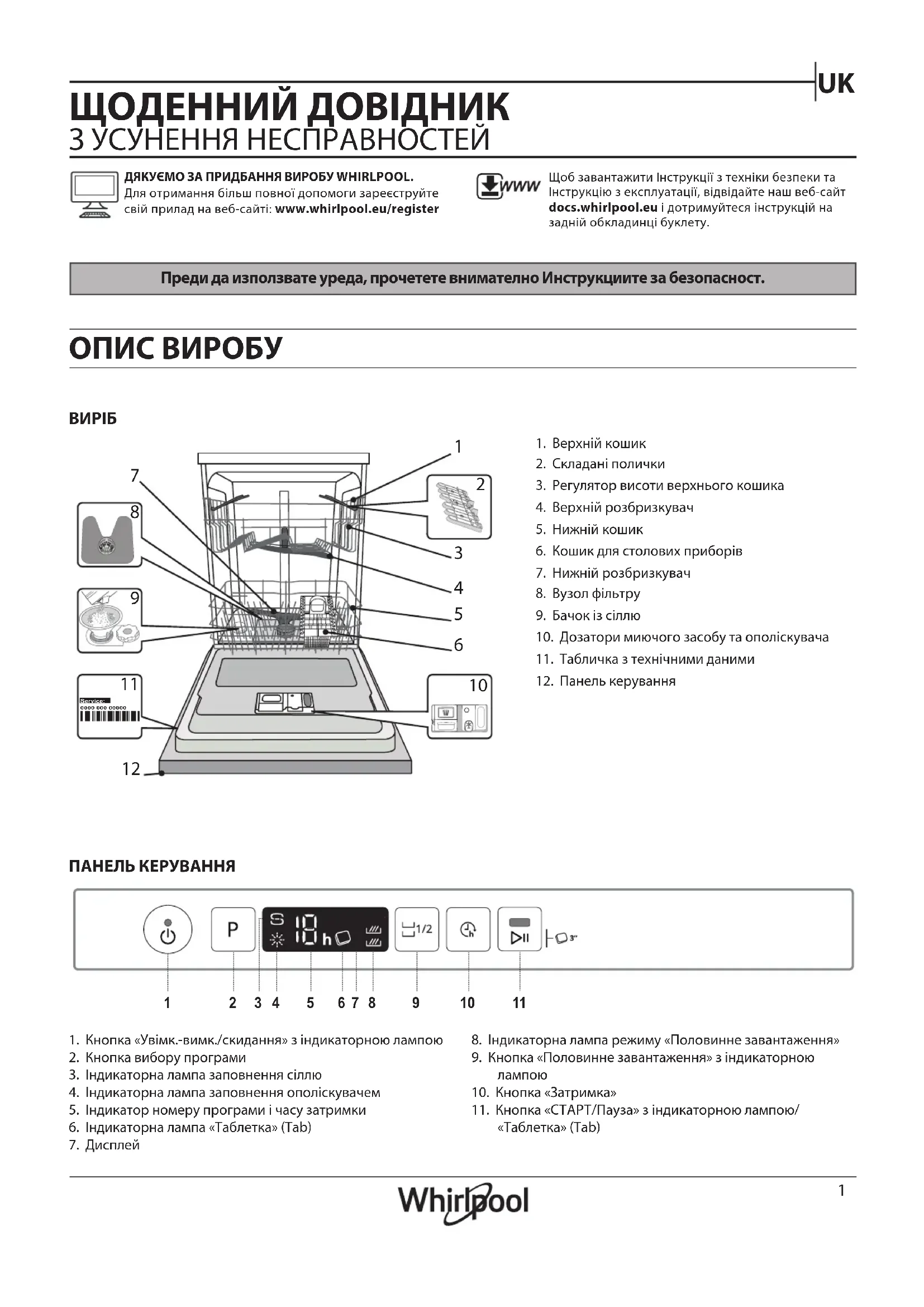 ОПИС ВИРОБУ ПАНЕЛЬ КЕРУВАННЯ 1. Верхній кошик2. Складані полички3. Регулятор висоти верхнього кошика4. Верхній розбризкувач5. Нижній кошик6. Кошик для столових приборів7. Нижній розбризкувач8. Вузол фільтру9. Бачок із сіллю10. Дозатори миючого засобу та ополіскувача11. Табличка з технічними даними12. Панель керуванняДЯКУЄМО ЗА ПРИДБАННЯ ВИРОБУ WHIRLPOOL. Для отримання більш повної допомоги зареєструйте свій прилад на веб-сайті: www.whirlpool.eu/registerЩоб завантажити Інструкції з техніки безпеки та Інструкцію з експлуатації, відвідайте наш веб-сайт docs.whirlpool.eu і дотримуйтеся інструкцій на задній обкладинці буклету.0000 000 00000 Service: