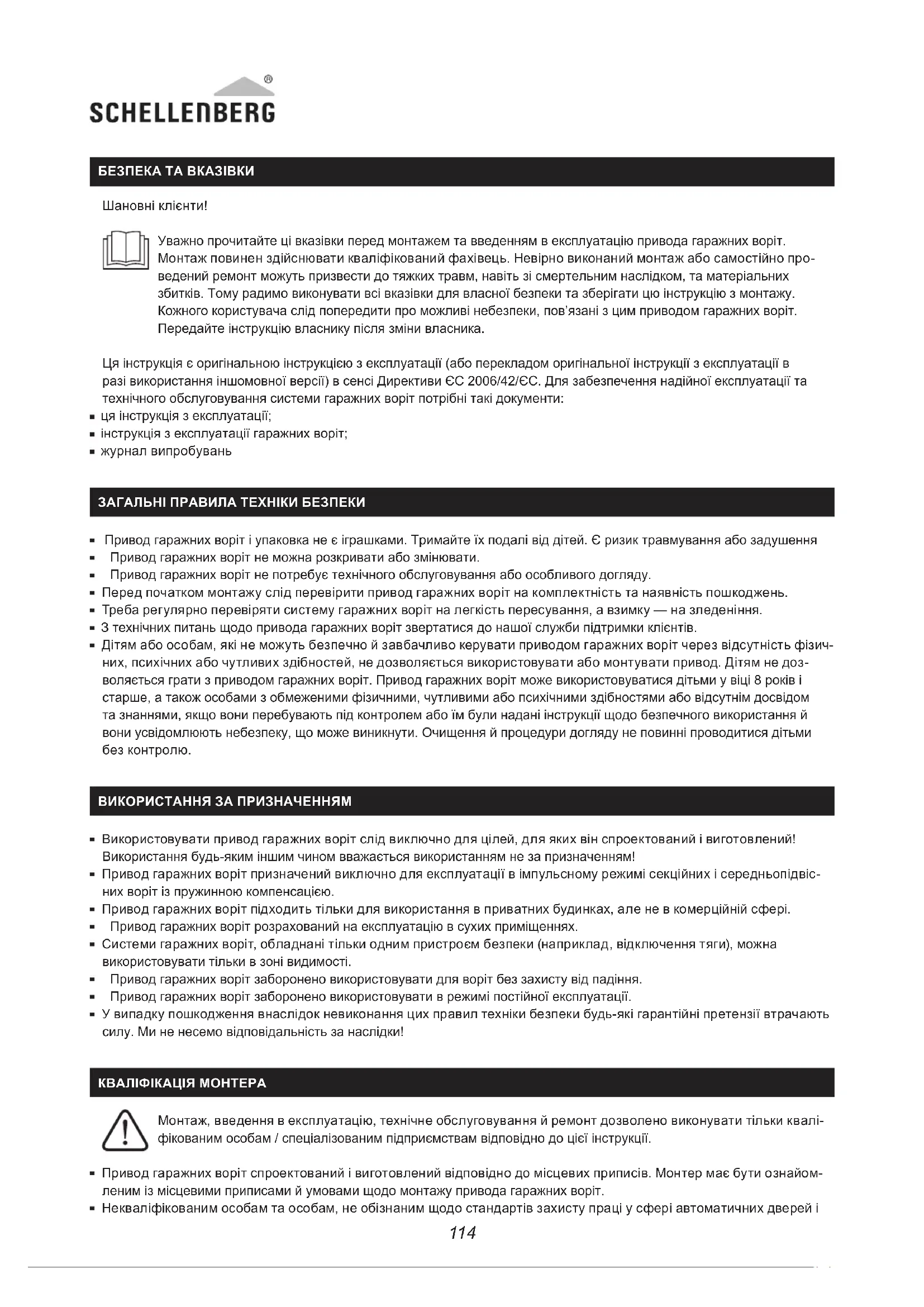 БЕЗПЕКА ТА ВКАЗІВКИ Шановні клієнти! Уважно прочитайте ці вказівки перед монтажем та введенням в експлуатацію привода гаражних воріт. Монтаж повинен здійснювати кваліфікований фахівець. Невірно виконаний монтаж або самостійно про- ведений ремонт можуть призвести до тяжких травм, навіть зі смертельним наслідком, та матеріальних збитків. Тому радимо виконувати всі вказівки для власної безпеки та зберігати цю інструкцію з монтажу. Кожного користувача слід попередити про можливі небезпеки, пов’язані з цим приводом гаражних воріт. Передайте інструкцію власнику після зміни власника. Ця інструкція є оригінальною інструкцією з експлуатації (або перекладом оригінальної інструкції з експлуатації в разі використання іншомовної версії) в сенсі Директиви ЄС 2006/42/ЄС. Для забезпечення надійної експлуатації та технічного обслуговування системи гаражних воріт потрібні такі документи: ця інструкція з експлуатації; інструкція з експлуатації гаражних воріт; журнал випробувань ЗАГАЛЬНІ ПРАВИЛА ТЕХНІКИ БЕЗПЕКИ Привод гаражних воріт і упаковка не є іграшками. Тримайте їх подалі від дітей. Є ризик травмування або задушення Привод гаражних воріт не можна розкривати або змінювати. Привод гаражних воріт не потребує технічного обслуговування або особливого догляду. Перед початком монтажу слід перевірити привод гаражних воріт на комплектність та наявність пошкоджень. Треба регулярно перевіряти систему гаражних воріт на легкість пересування, а взимку — на зледеніння. З технічних питань щодо привода гаражних воріт звертатися до нашої служби підтримки клієнтів. Дітям або особам, які не можуть безпечно й завбачливо керувати приводом гаражних воріт через відсутність фізич- них, психічних або чутливих здібностей, не дозволяється використовувати або монтувати привод. Дітям не доз- воляється грати з приводом гаражних воріт. Привод гаражних воріт може використовуватися дітьми у віці 8 років і старше, а також особами з обмеженими фізичними, чутливими або психічними здібностями або відсутнім досвідом та знаннями, якщо вони перебувають під контролем або їм були надані інструкції щодо безпечного використання й вони усвідомлюють небезпеку, що може виникнути. Очищення й процедури догляду не повинні проводитися дітьми без контролю. ВИКОРИСТАННЯ ЗА ПРИЗНАЧЕННЯМ Використовувати привод гаражних воріт слід виключно для цілей, для яких він спроектований і виготовлений! Використання будь-яким іншим чином вважається використанням не за призначенням! Привод гаражних воріт призначений виключно для експлуатації в імпульсному режимі секційних і середньопідвіс- них воріт із пружинною компенсацією. Привод гаражних воріт підходить тільки для використання в приватних будинках, але не в комерційній сфері. Привод гаражних воріт розрахований на експлуатацію в сухих приміщеннях. Системи гаражних воріт, обладнані тільки одним пристроєм безпеки (наприклад, відключення тяги), можна використовувати тільки в зоні видимості. Привод гаражних воріт заборонено використовувати для воріт без захисту від падіння. Привод гаражних воріт заборонено використовувати в режимі постійної експлуатації. У випадку пошкодження внаслідок невиконання цих правил техніки безпеки будь-які гарантійні претензії втрачають силу. Ми не несемо відповідальність за наслідки! КВАЛІ