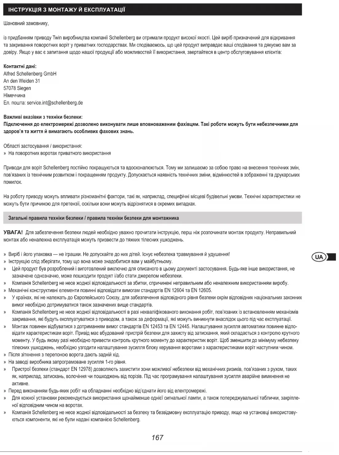 Шановний замовнику, із придбанням приводу Twin виробництва компанії Schellenberg ви отримали продукт високої якості Цей виріб призначений для відкривання та закривання поворотних воріт у приватних господарствах Ми сподіваємось, що цей продукт виправдає ваші сподівання та дякуємо вам за довіру Якщо у вас є запитання щодо нашої продукції або можливостей її використання, звертайтеся в центр обслуговування клієнтів: Контактні дані: Alfred Schellenberg GmbH An den Weiden 31 57078 Siegen