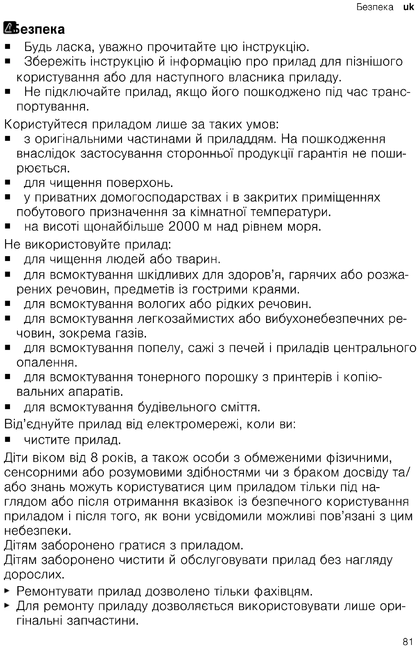 Для чистки твердых напольных покры- тий используйте предусмотренную для этого щетку для твердых напольных по- крытий с функцией очистки щелей (если она входит в комплект). Данные о мощности этого прибора основаны на методах измерения и рас- чета согласно Регламенту (ЕС) №666/2013 и стандартам EN60312-1, EN60704-2-1, EN60335-2-2. 80Безпека uk Безпека Безпека ¡ Будь ласка, уважно прочитайте цю інструкцію. ¡ Збережіть інструкцію й інформацію про прилад для пізнішого користування або для наступного власника приладу. ¡ Не підключайте прилад, якщо його пошкоджено під час транс- портування. Користуйтеся приладом лише за таких умов: ¡ з оригінальними частинами й приладдям. На пошкодження внаслідок застосування сторонньої продукції гарантія не поши-