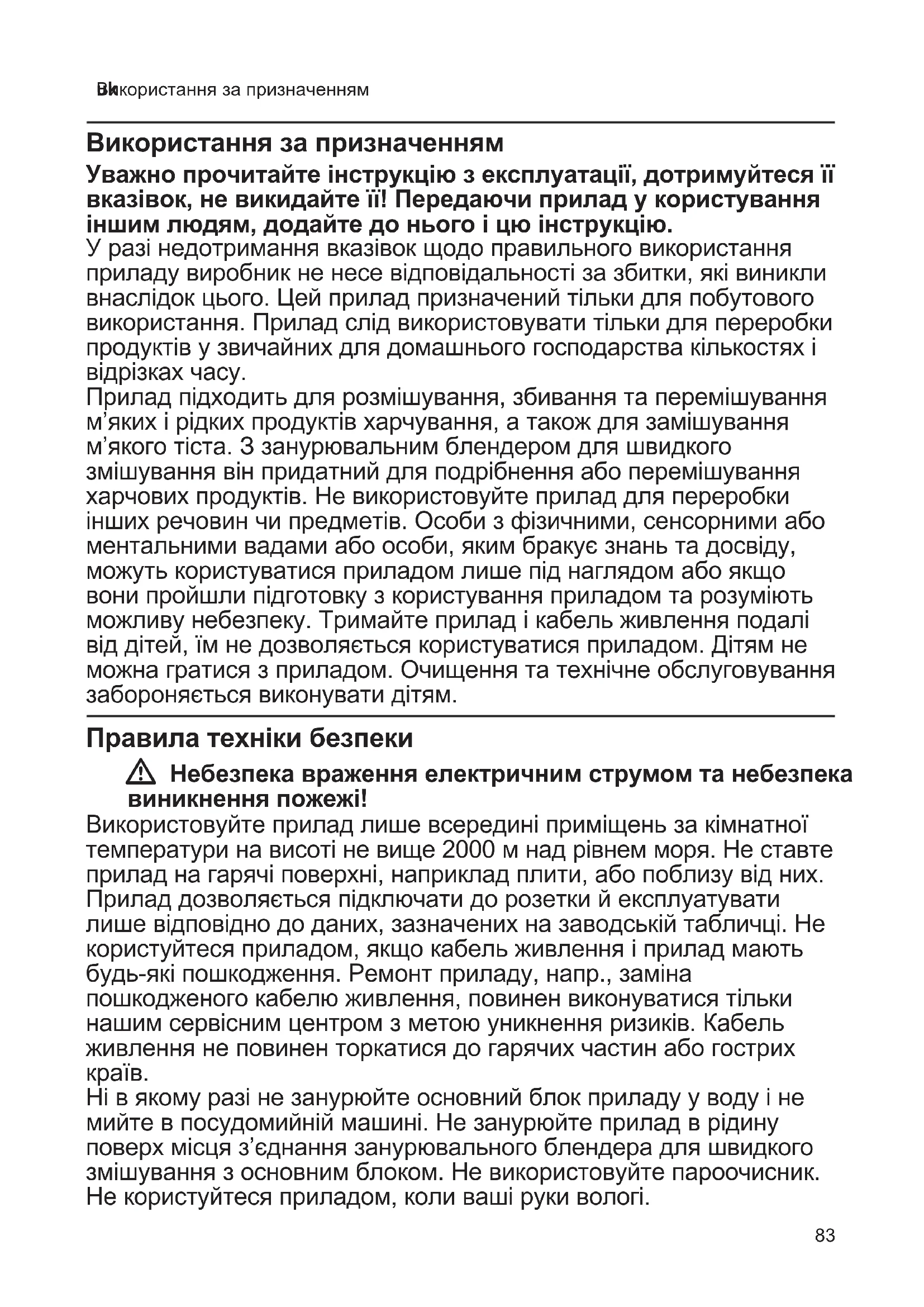 Ні в якому разі не занурюйте основний блок приладу у воду і не мийте в посудомийній машині. Не занурюйте прилад в рідину поверх місця з’єднання занурювального блендера для швидкого змішування з основним блоком. Не використовуйте пароочисник. Не користуйтеся приладом, коли ваші руки вологі.84 uk Правила техніки безпеки Прилад необхідно постійно вимикати з мережі перед кожним використанням, за відсутності догляду, перед монтажем, демонтажем чи чищенням та у разі несправності. W Увага! Існує небезпека травмування! Ніколи не підключайте прилад до вимикачів з годинниковим механізмом чи розеток з дистанційним керуванням. У разі порушення електропостачання прилад залишається ввімкненим і знову запускається після відновлення електропостачання. Негайно вимкніть прилад. Ніколи не залишайте ввімкнений прилад без нагляду! У жодному разі не залишайте прилад ввімкненим довше, ніж це потрібно для переробки продуктів. Відразу ж після використання приладу слід почекати, щоб повністю зупинився привод. Перед заміною приладдя або комплектуючих елементів, які рухаються під час роботи, виріб слід вимкнути та від’єднати від електромережі. Насадки можна встановлювати та знімати тільки після зупинки приладу – після вимкнення прилад ще деякий час рухається. Не вмикайте прилад ухолосту. Ніколи не торкайтеся обертових деталей. Ніколи не торкайтеся ножа на ніжці блендера. Ніколи не чистьте ніж голими руками. Користуйтеся щіткою. Захищайте довге волосся та вільні елементи одягу від потрапляння в обертовi насадки. Прилад використовуйте тільки з оригінальними частинами та приладдям. Попарно використовуйте тільки насадки однакового типу (напр. 2 гачки для замішування). Ні в якому разі не використовуйте одночасно насадки і приладдя, встановлені в отворі в задній частині приладу. W Небезпека опіків! Обережно при обробці гарячих продуктів. При переробці гарячі продукти можуть розбризкуватися. W Небезпека шкоди для здоров’я! Бруд на поверхнях може становити небезпеку для здоров’я. Виконуйте вказівки з чищення. Поверхні, що контактують з харчовими продуктами, потрібно чистити перед кожним користуванням. W Важливо! При використанні занурювального блендера для швидкого змішування в каструлі спочатку треба зняти каструлю з плити. Ємність блендера не придатна для використання в мікрохвильовій печі. Після кожного використання, а також після тривалого невикористання прилад необхідно очищати згідно з інструкціями. X«Очищення»див.стор.8785