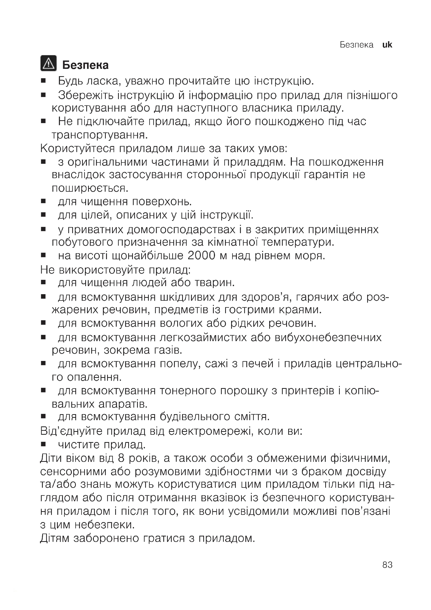 ¡ Будь ласка, уважно прочитайте цю інструкцію. ¡ Збережіть інструкцію й інформацію про прилад для пізнішого користування або для наступного власника приладу. ¡ Не підключайте прилад, якщо його пошкоджено під час транспортування. Користуйтеся приладом лише за таких умов: ¡ з оригінальними частинами й приладдям. На пошкодження внаслідок застосування сторонньої продукції гарантія не поширюється. ¡ для чищення поверхонь. ¡ для цілей, описаних у цій інструкції. ¡ у приватних домогосподарствах і в закритих приміщеннях побутового призначення за кімнатної температури. ¡ на висоті щонайбільше 2000м над рівнем моря. Не використовуйте прилад: ¡ для чищення людей або тварин. ¡ для всмоктування шкідливих для здоров’я, гарячих або роз- жарених речовин, предметів із гострими краями. ¡ для всмоктування вологих або рідких речовин. ¡ для всмоктування легкозаймистих або вибухонебезпечних речовин, зокрема газів. ¡ для всмоктування попелу, сажі з печей і приладів центрально- го опалення. ¡ для всмоктування тонерного порошку з принтерів і копію- вальних апаратів. ¡ для всмоктування будівельного сміття. Від’єднуйте прилад від електромережі, коли ви: ¡ чистите прилад. Діти віком від 8років, а також особи з обмеженими фізичними, сенсорними або розумовими здібностями чи з браком досвіду та/або знань можуть користуватися цим приладом тільки під на- глядом або після отримання вказівок із безпечного користуван- ня приладом і після того, як вони усвідомили можливі пов’язані з цим небезпеки. Дітям заборонено гратися з приладом.uk Безпека